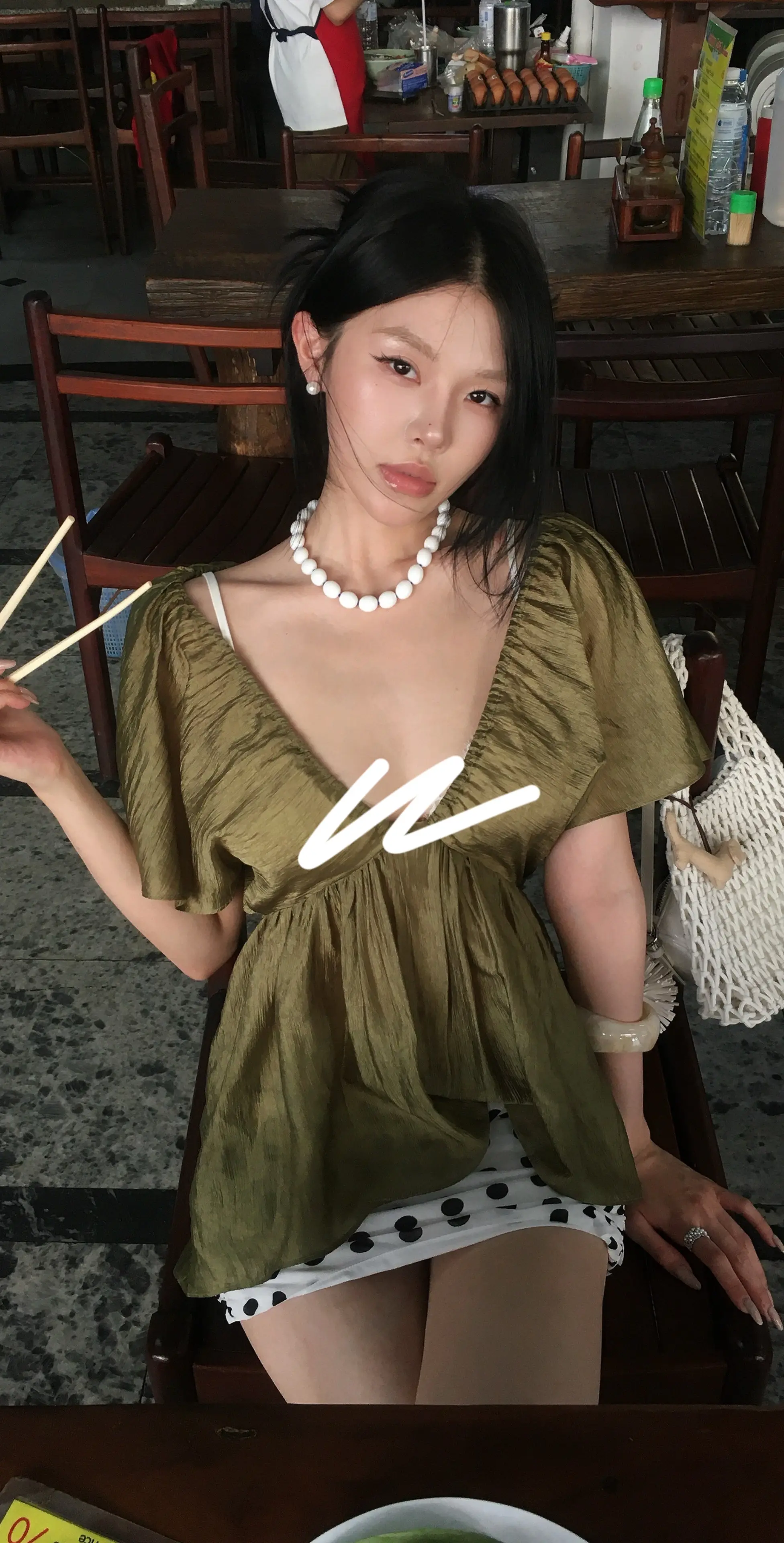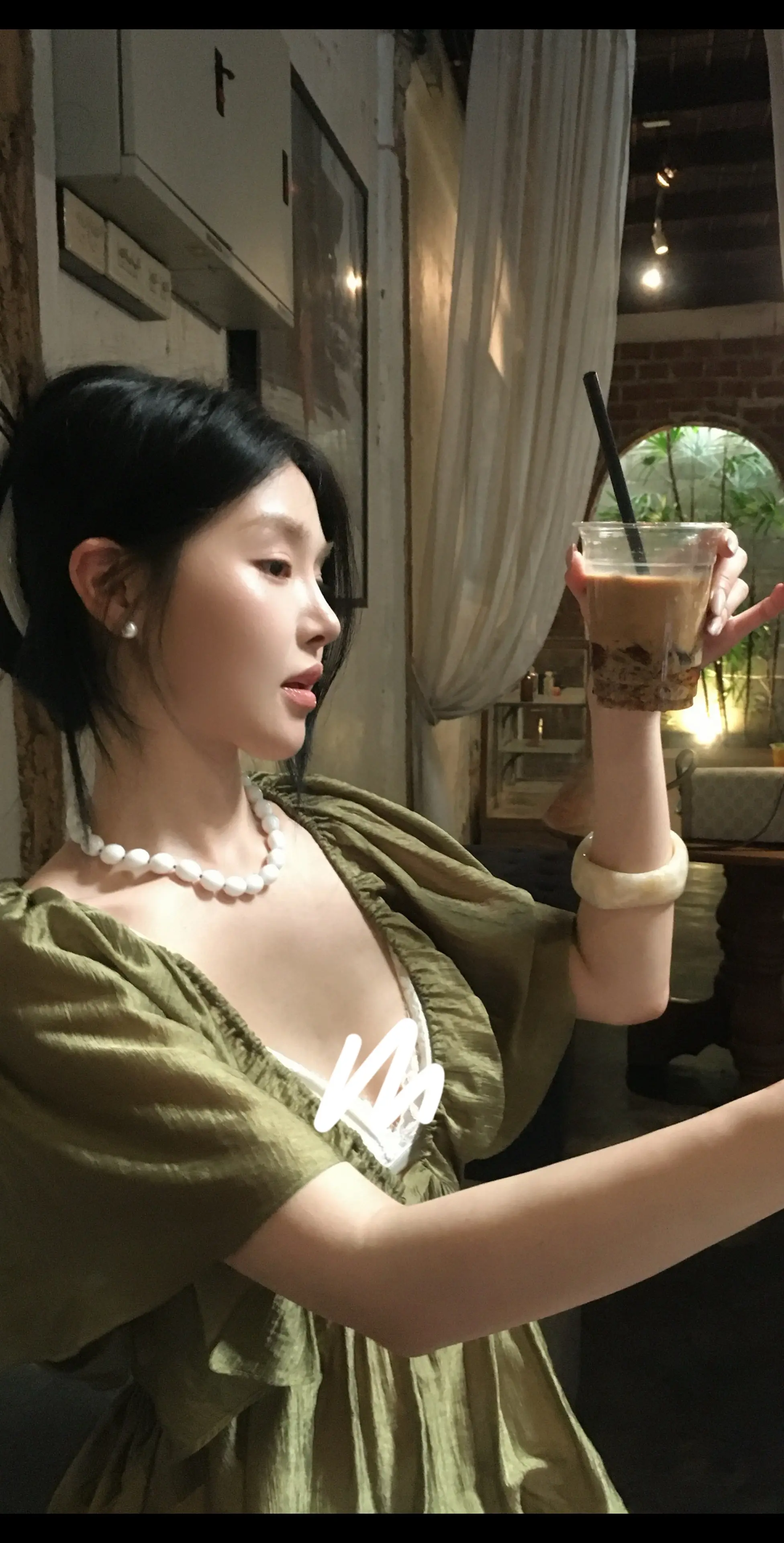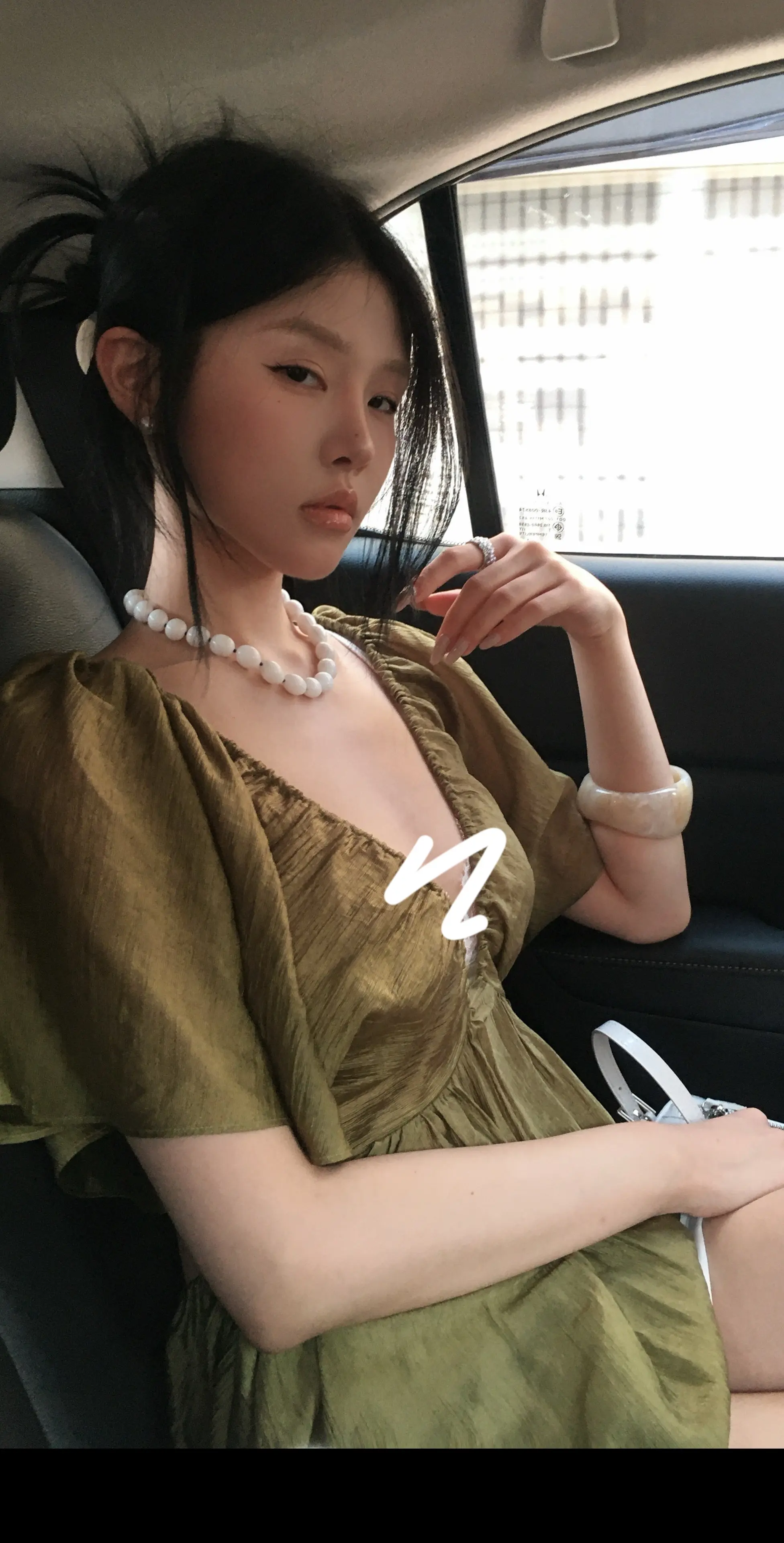 竖条纹旗袍的开叉恰到好处,衬得腿型修长,线条舒展而柔和;肤色均匀且细腻,姿态优雅