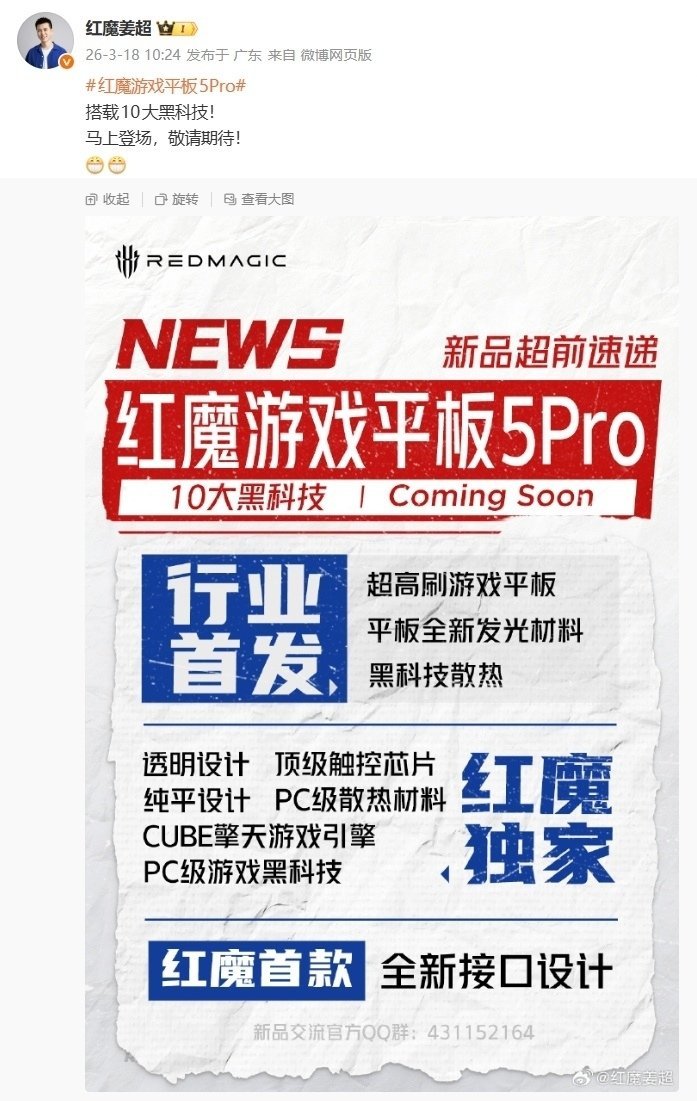 红魔游戏手机产品总经理姜超今日发布预告,红魔游戏平板 5 Pro 将搭载 10 大黑科技,具体如下: