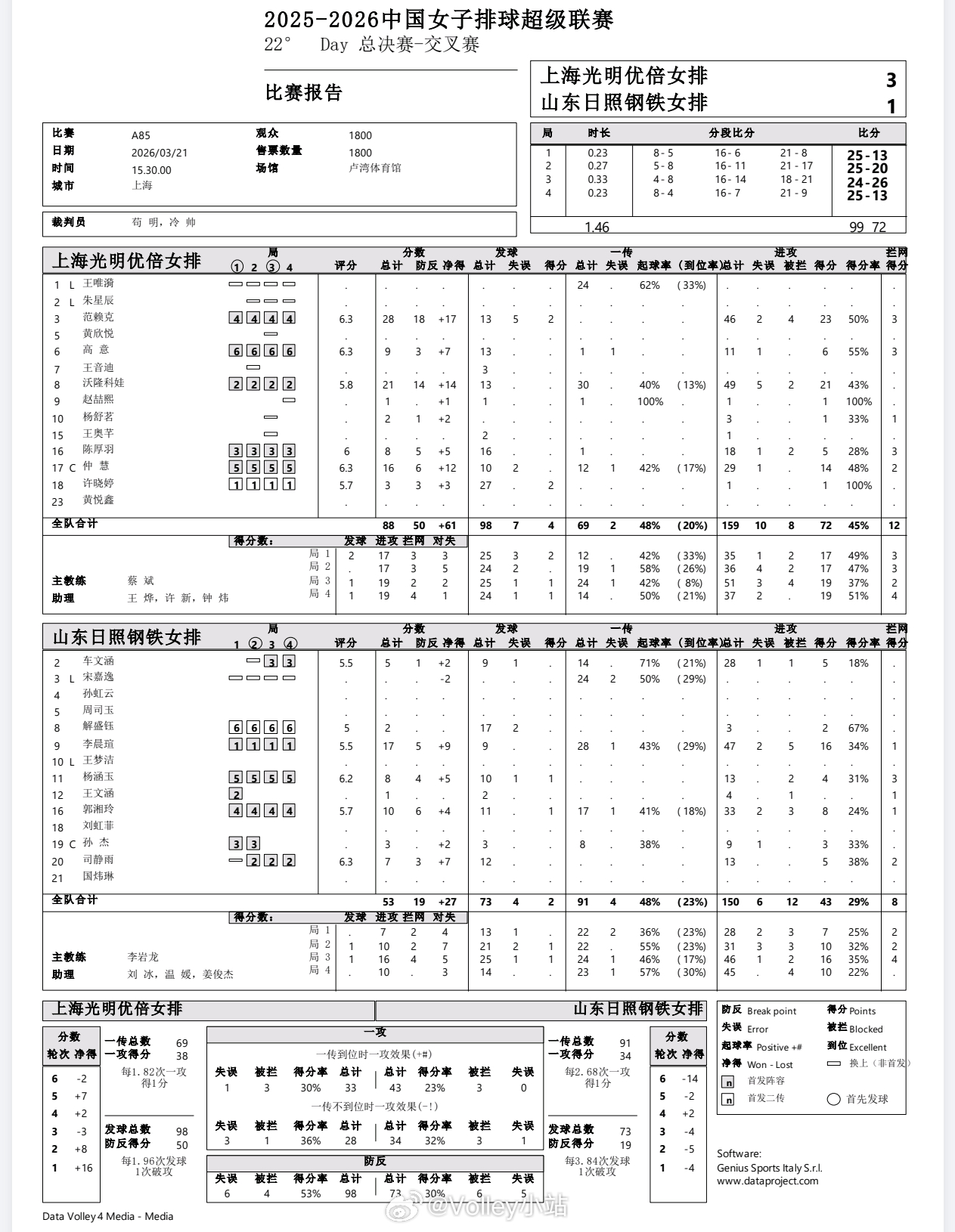 【技术统计】排超联赛半决赛第二回合,上海女排3比1山东女排(25-13 25-20 24-26 25-13)