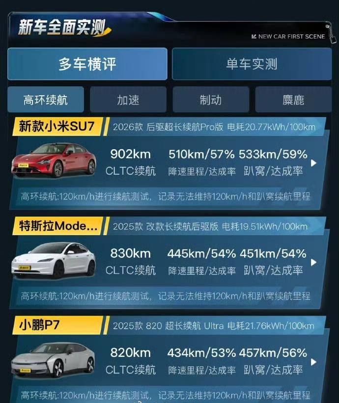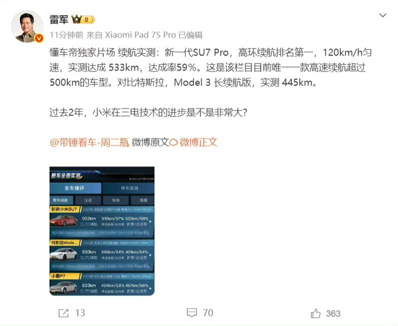 今日,雷军在个人微博上发布了懂车帝对新一代小米SU7 Pro的实测结果,并配文发问:“过去 2 年,小米在三电技术的进步是不是非常大?” 据了解,近日懂车帝独家发布了新一代小米SU7 Pro的高环续航实测数据,根据实测数据显示,新一代小米SU7 Pro在120km/h匀速工况下,375kg配重下,实测续航达成533km,达成率59%,成为该栏目目前唯一一款高速续航超过500km的车型,在高速续航表现中领跑榜单, CLTC 续航为 902km。 电车高速能有五百多公里续航那是相当不错的!要知道电车上了高速掉电速度是真快,如果是刚开电车的人,看着电量百分比一直掉心里会很没底。 所以从实际体验来说,它这个续航其实已经完全比得上油车体验了,因为一般开高速不会全程120,也不会有375kg的配重,能耗肯定会更低,最终续航肯定会超过500km的。