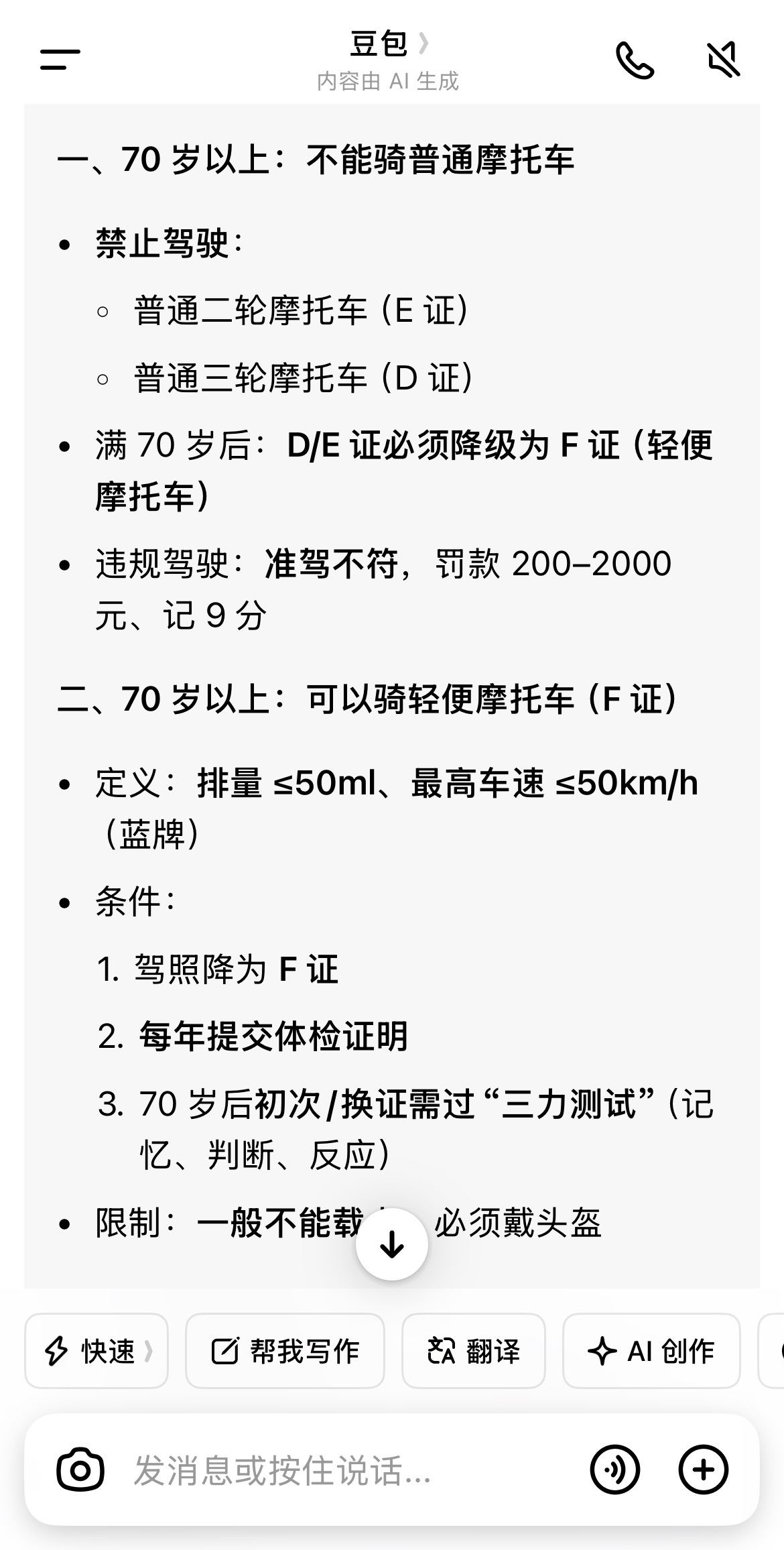 今天表弟的孩子过 10 岁生日,遇到我舅舅,他跟我吐槽,说70 岁以上老人不允许骑摩托车,驾照强制降级为F照,只能骑轻摩。我第一次听说,查了一下,还真是。我老舅活力四射,常年爬山、徒步旅游,身体倍儿棒。我就搞不懂,他为啥不能骑摩托车?