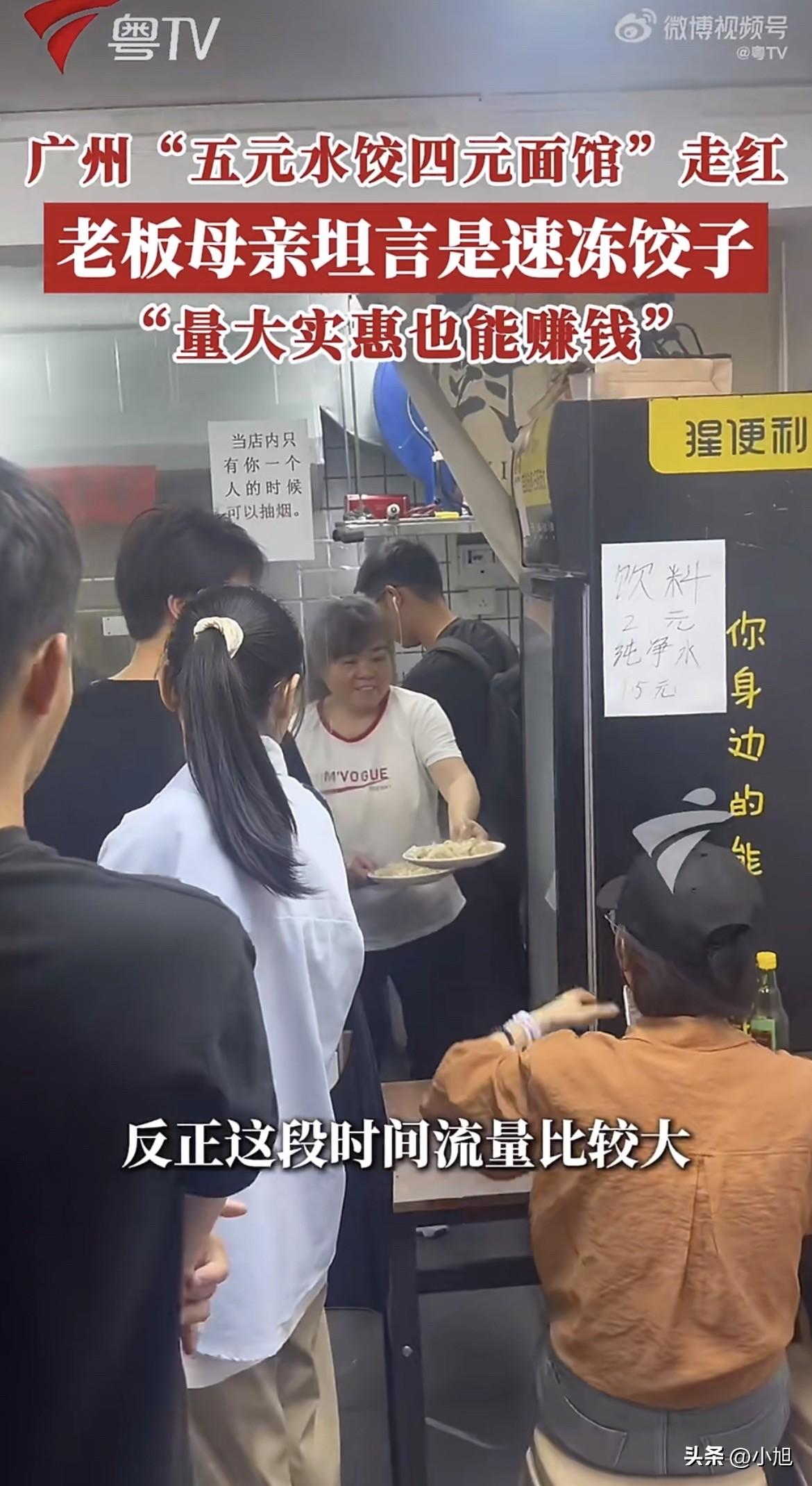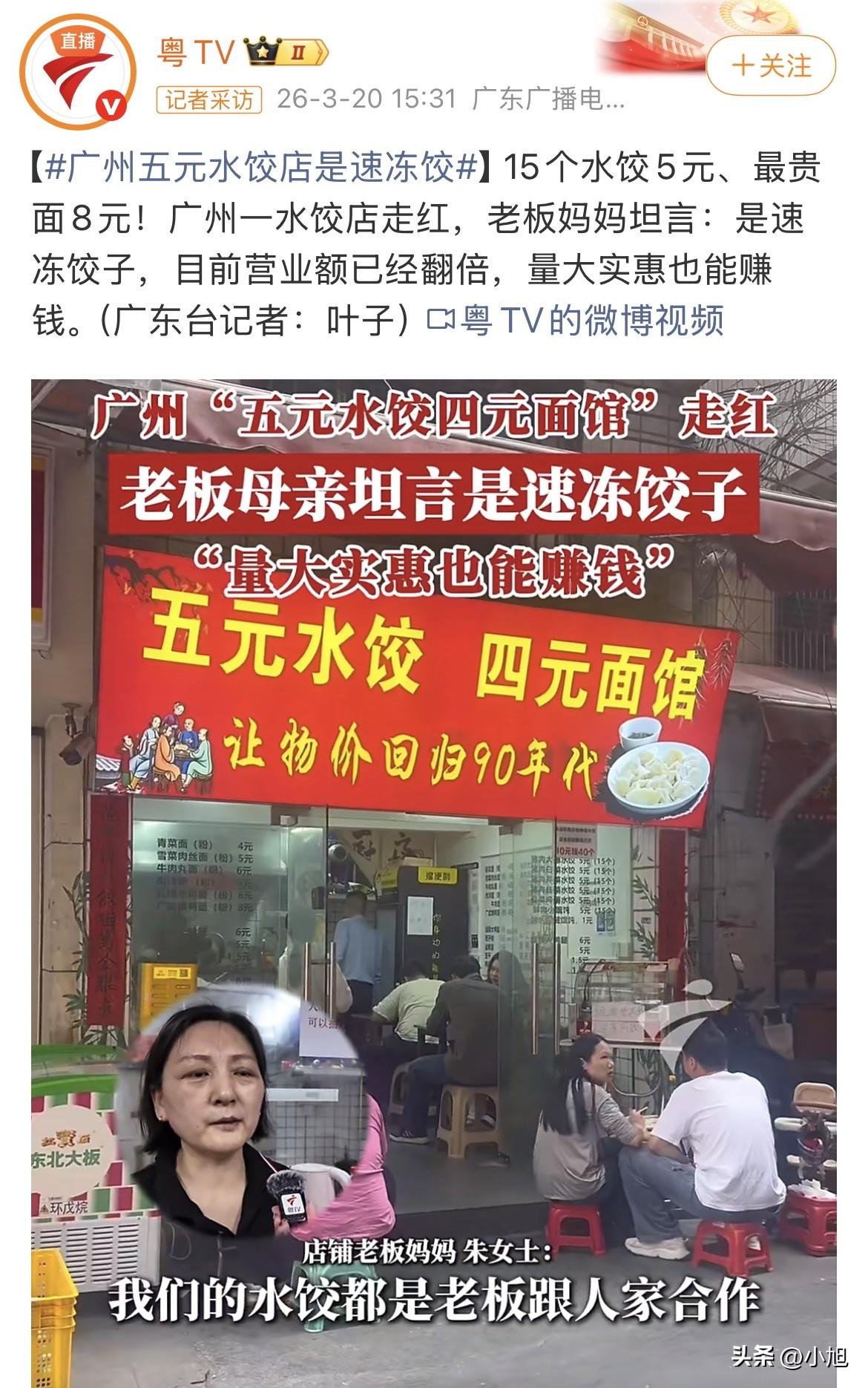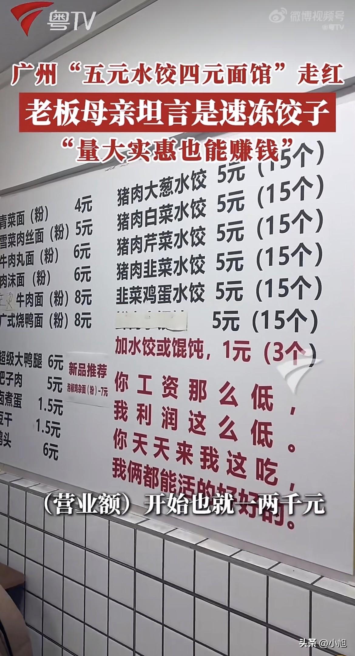 广州这家5元水饺店,老板把话挑明了:就是速冻的。 昨天刷到这条新闻,说实话,第一反应跟很多人一样——5块钱15个饺子,这价格在广州这种地方,要么是老板做慈善,要么就是食材有问题。 结果记者跑去一探究竟,老板倒是坦荡得很,直接在店里挂出配料表。猪肉排在小麦粉、饮用水、韭菜的后面,第四位才是猪肉,后面还有大豆蛋白。老板的原话是:“那是模仿肉的东西,但没有害处,主要是为了降成本。” 这家店藏在广州天河区东圃的城中村里,店面只有十来平方米,四张桌子,门外加两张折叠凳,没有空调,没有风扇。但中午排队的人挤到了门口,大多是年轻人,有刚下班的骑手,有背着书包的大学生。 老板张先生,89年的江苏人,做过电商,搞过直播。今年1月开了这家店,从中午11点干到次日凌晨2点,连续两个多月没休息过。他自己算过账:每碗饺子食材成本2块钱左右,一天能卖500多份,刨去2000块的月租和三个冰箱的电费,每天能赚1000块纯利润。 菜单上有一行小字:“你工资那么低,我利润那么低,你天天来我这吃,我俩都能活得好好的。” 这话说得直白,但仔细想想,其实是把算盘打明白了。 有记者问他为什么不卖贵点,他说得很实在:“要是我卖15块一碗,跟别的店没啥两样,我这店位置又不太好,很容易就倒闭了。” 这是真话。城中村里沙县小吃、猪脚饭遍地都是,价格、分量、味道都差不多,你一个新来的凭什么分一杯羹?做味道特色成本太高,做环境特色投入太大,唯一能快速打出差异化的,就是价格。 老板的妈妈朱女士在店里帮忙,跟记者说:“现在一天营业额有3000多块,比以前翻倍了。”对于涨价,朱女士直接放话:“永远5元,未来价格也不会升。” 有人担心这种低价会不会挤压上游,也有人问老板怕不怕被人模仿。他的回答挺有意思:“没关系,如果模仿的人多了,更多人能吃到实惠的饭。” 这话说得敞亮。 其实仔细想想,你去超市买速冻水饺,稍微有点牌子的,一斤怎么也得十几二十块。5块钱15个饺子,算下来大概七八两的量,批发价也就4块钱左右一斤。你自己买回家煮,要烧水、要洗碗、要收拾厨房。人家煮好端到你面前,还不用你收拾,就收你5块钱。 这笔账,谁都会算。 评论区有人说这是“餐饮界的蜜雪冰城”,有人说“5块钱你还要什么自行车”。但也有人担心便宜没好货,盯着配料表里的大豆蛋白不放。 老板回应过这个质疑:“开店时我买了400多块钱的饺子,每种都自己尝过,一点科技都没有。” 这事说到底,就是一个愿打一个愿挨。人家明明白白告诉你用的是速冻饺子,配料表也挂出来了,不玩虚的,不搞噱头。你觉得介意,可以不去;你觉得能接受,5块钱吃顿饱饭,也没什么不好。 毕竟在这个随便一杯奶茶都要二三十的时代,还有人愿意守着一口锅从中午煮到凌晨两点,就为了让你花5块钱吃上15个饺子。 你怎么看这种低价餐饮模式