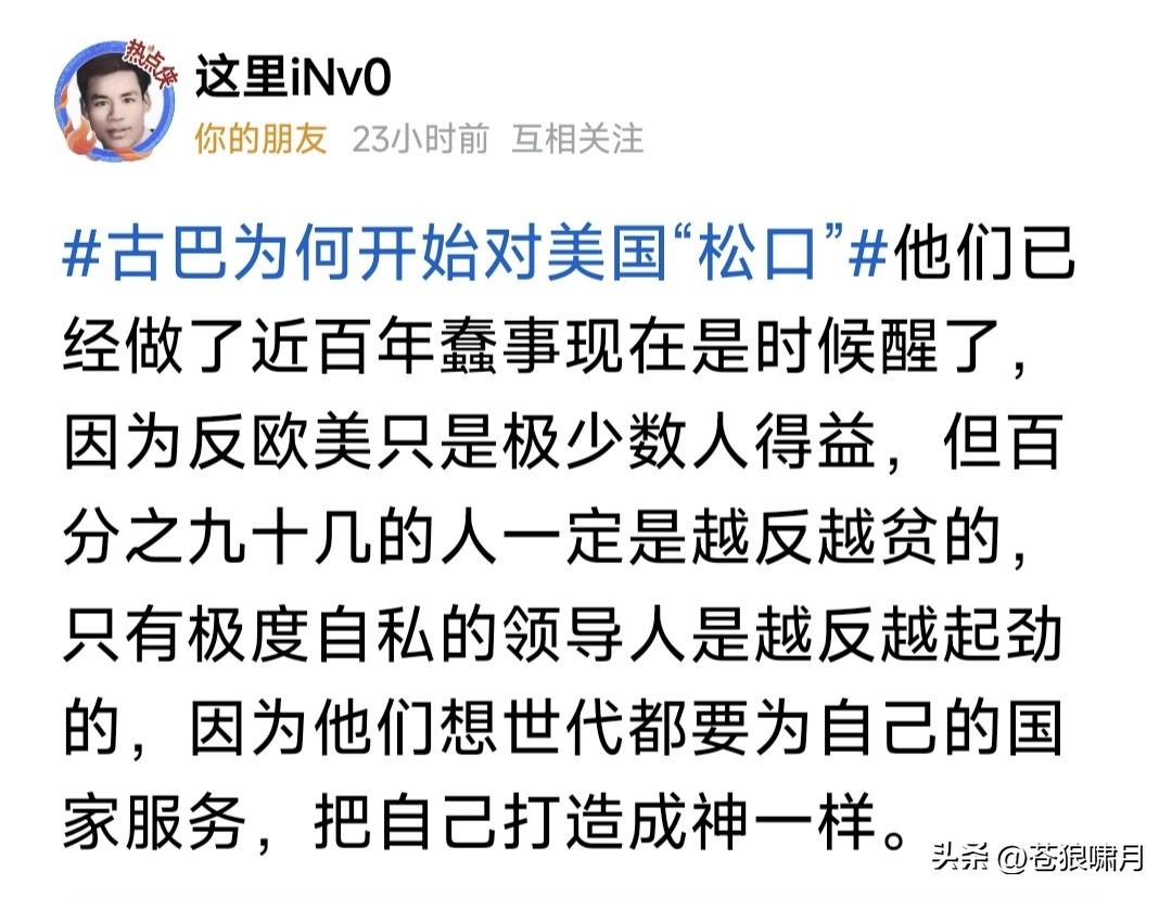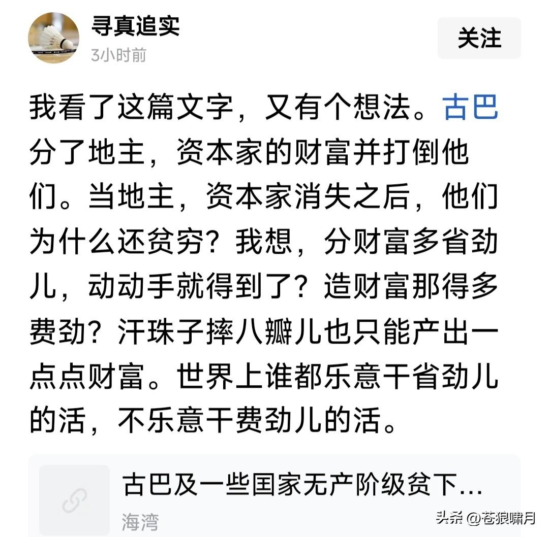 这两天看不到古巴消息了!是否正在与美国谈判?忽然想到“京城老徐”几句话:古巴是靠山山倒,靠墙墙塌!他的山是俄罗斯,他的墙是委内瑞拉。 有网友提问:古巴为何“松口”,要与美国谈判!并自答曰:做了近百年糊涂事,坚持反美反欧,结果越反人民生活越贫穷,到了应该清醒的时候了! 有网友质疑:古巴打倒地主资本家,分他们的财产,应该富裕才对,怎么越弄越穷了?看来创造财富太难,分掉共享很容易,但不会再产生了吧? 苍狼对此不多评论,只想谈两点: 1.无论什么国家,经常搞“斗争”不是好办法!对内打倒富人,财产分给穷人!对外没收外企收归国有,社会不再产生财富,肯定会越来越穷吧! 2.在法律框架下,融入世界合作发展,招商引资办企业,允许能人发家致富,利用法规征收税利,让企业和富人周济穷人,社会才能越来越富! 这是美欧发达国家的经验,也是中国改革开放四十年的实践体会!沿着改开之路往前走,我们定会持续发展,不断积累财富,实现富民强国啊! …………