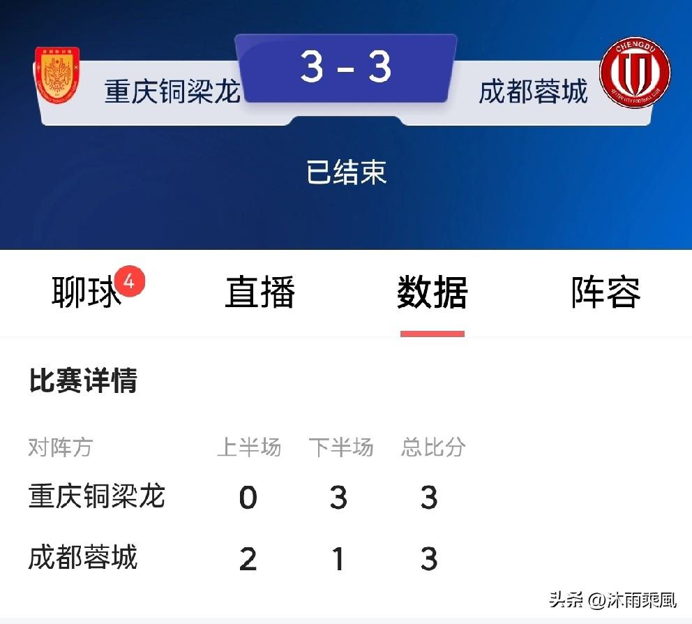 跌宕起伏的一场川渝德比,最终双方3:3握手言和。 这场比赛确实精彩,这样的比分可能蓉城球迷和铜梁龙球迷都会觉得遗憾和可惜吧。 蓉城缺少了费利佩进攻确实下降了一个档次,无论是王子铭还是拜合拉木,与费利佩相比都差的不是一星半点。 铜梁龙下半场踢的非常顽强,在0:2落后的情况下反超比分,可惜补时阶段没有把握住,罗慕洛还是蓉城的大腿级球员,拜合拉木终于进球了,只是属于被动进球,韦世豪的头球顶到拜合拉木背上弹进球门! 川渝德比,好看,过瘾! “川渝德比”一触即发