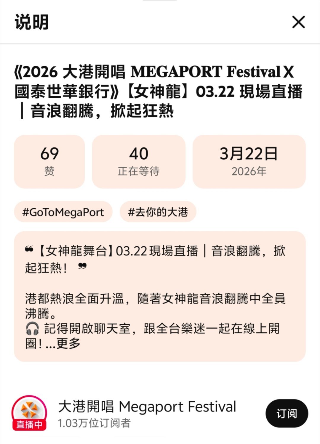 溫馨提示明天大港開唱女神龍場有ytb直播,鄭宜農場次在18:00-18:40
