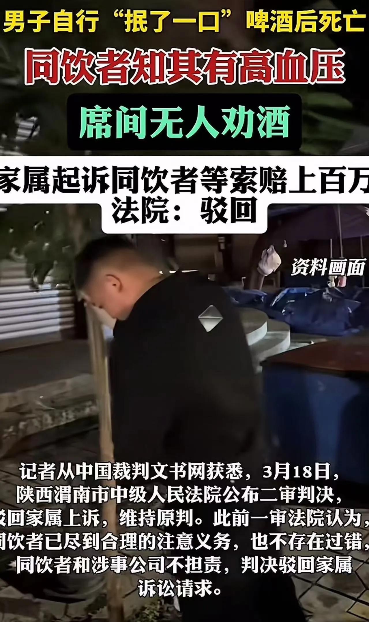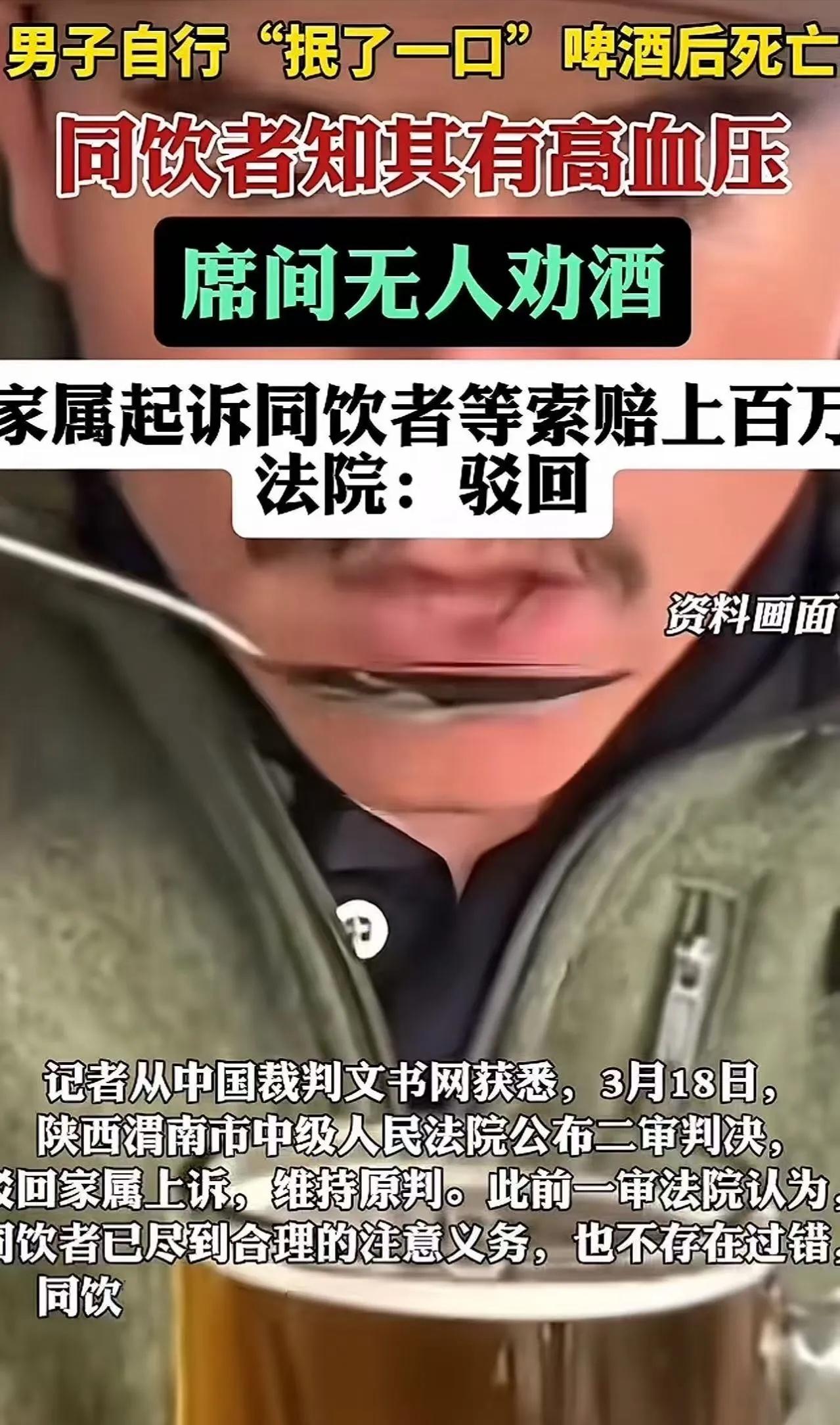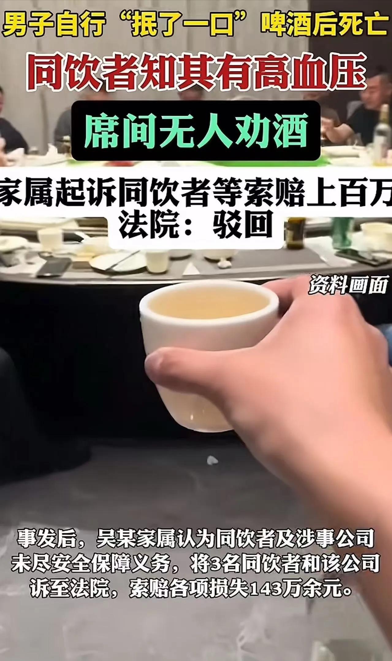 “这次必须给法院点赞!” 男子主动抿了一口啤酒后猝死,家属索赔143万!法院硬气判决:驳回!网友:吓得我都不敢请朋友喝酒了 酒桌上出了人命,家属张口就要143万。这事儿要是搁前几年,不少人可能觉得“多少得赔点”。但这次,法院没惯着。一个判决下来,有人拍手叫好,有人后背发凉——以后请朋友吃饭,到底还敢不敢上酒? 一、事情的来龙去脉:一口啤酒,一条人命,一场官司 这事儿发生在2023年5月,陕西富平。 老吴是个生意人,去一家公司谈项目。对方挺客气,中午安排吃饭,下午陪着考察,晚上又张罗了一桌饭局,连同客户、员工一共9个人。 商务宴请嘛,酒是少不了的。但开席前,老吴特意跟老板透了底:“我有高血压,医生叮嘱不能喝酒。” 老板一听,立马点头:“行,那咱今天就不喝酒,以茶代酒。” 可饭桌上有个工程师嘴馋,自己点了三瓶啤酒,几个人分着喝,也没喝多少。整个过程,没人给老吴倒酒,更没人劝酒、灌酒。大家都记着他有高血压这茬儿,对他挺照顾。 眼看饭局快散了,老吴可能觉得有点过意不去,或者想活跃下气氛,主动拿起酒瓶,往自己那个小玻璃杯里倒了大概三分之一的啤酒。他端着杯子,跟大家示意了一下,然后——抿了一口。 就这一口,真就润了润嘴唇那种。 晚上8点,公司的人把老吴安安稳稳送回了酒店休息。谁能想到,第二天下午1点多,酒店服务员去查房,发现老吴直挺挺地躺在地上,人已经没了。120赶来抢救,无力回天。医院开的死亡证明上写着:呼吸心跳骤停。 人走了,家属悲痛欲绝,这能理解。但接下来的操作,让很多人坐不住了。 家属一纸诉状把同桌喝酒的3个人和那家公司全告了,张嘴就要赔偿143万余元!理由很“充分”:你们明知道他有高血压还让他喝酒,没尽到安全保障义务,人是在跟你们吃完饭后死的,你们得赔! 二、法律分析:法院为什么一分不判?三个理由说得明明白白 一审法院审理后,判决书写得那叫一个理直气壮,咱们一条条拆开看: 第一,没人劝酒,酒是老吴自己主动喝的。 全程没人给他倒酒,没人劝他喝,他自己主动倒、自己主动抿的那一口。这在法律上叫“自甘风险”——一个成年人对自己的身体状况最清楚,明知有高血压还主动喝酒,后果应当自己承担。同桌的人没有强迫、没有灌酒,就不构成过错。 第二,送医义务已经履行到位。 晚上8点,公司的人把老吴安全送回酒店休息,当时人没有任何异常。从法律上讲,共同饮酒者的安全保障义务,主要体现在“不强迫劝酒”和“安全护送”这两点上。这两点,被告都做到了。 第三,因果关系不成立。 医院死亡证明写的是“呼吸心跳骤停”,没有证据证明死亡就是那一口啤酒直接导致的。高血压患者本身就有猝死风险,可能是自身疾病突发,跟那口酒没有必然的因果关系。法律讲的是“谁主张谁举证”,家属拿不出证据,法院就不能硬判赔偿。 综上,一审判决:驳回全部诉讼请求,一分钱不用赔! 家属不服,上诉。二审法院:维持原判!这事儿,尘埃落定。 三、观点与启发:这一判,斩断的是“按闹分配”的歪风 这个判决为什么让这么多人叫好?说白了,是因为过去有些案子,明明当事人自己作死,法院却为了“息事宁人”,判同桌饮酒者承担所谓的“次要责任”或“人道主义补偿”。那种“和稀泥”的判决,表面上看是照顾了死者家属,实际上寒了守法者的心,还传递了一个极其危险的信号:只要我死了,你就得赔钱。 这次法院的硬气判决,明确告诉所有人:过错责任原则是底线。没有过错,就没有赔偿。 哪怕你哭得再惨,哪怕你是死者家属,也不能突破法律的公平红线。 从法律普及的角度看,这个案子也给我们提了三个醒: · 对喝酒的人: 自己的身体自己负责,别把安全指望别人替你兜底。 · 对请客的人: 不劝酒、不灌酒、把人安全送到,做到这三条,法律上你就站得住脚。 · 对家属: 亲人走了确实悲痛,但索赔得有依据。动辄百万的诉讼,如果没有事实和法律支撑,最后赔上的不光是诉讼费,还有自己的理。 结论:法律保护的是弱者,不是无理者的贪婪 “吓得我都不敢请朋友喝酒了”——网友这句调侃,其实点出了很多人心里的担忧:如果法院不分青红皂白就判赔,以后谁还敢组局?谁还敢跟朋友吃顿饭? 好在,这次法院给出了明确答案:法律不保护无理取闹,更不鼓励“谁死谁有理”。这一判,大快人心。 最后想问问大家:你觉得在酒桌上出了事,同桌的人到底该不该担责?担责的边界又该划在哪里?欢迎在评论区聊聊你的看法。 (本文综合自陕西富平法院相关判决及公开报道)