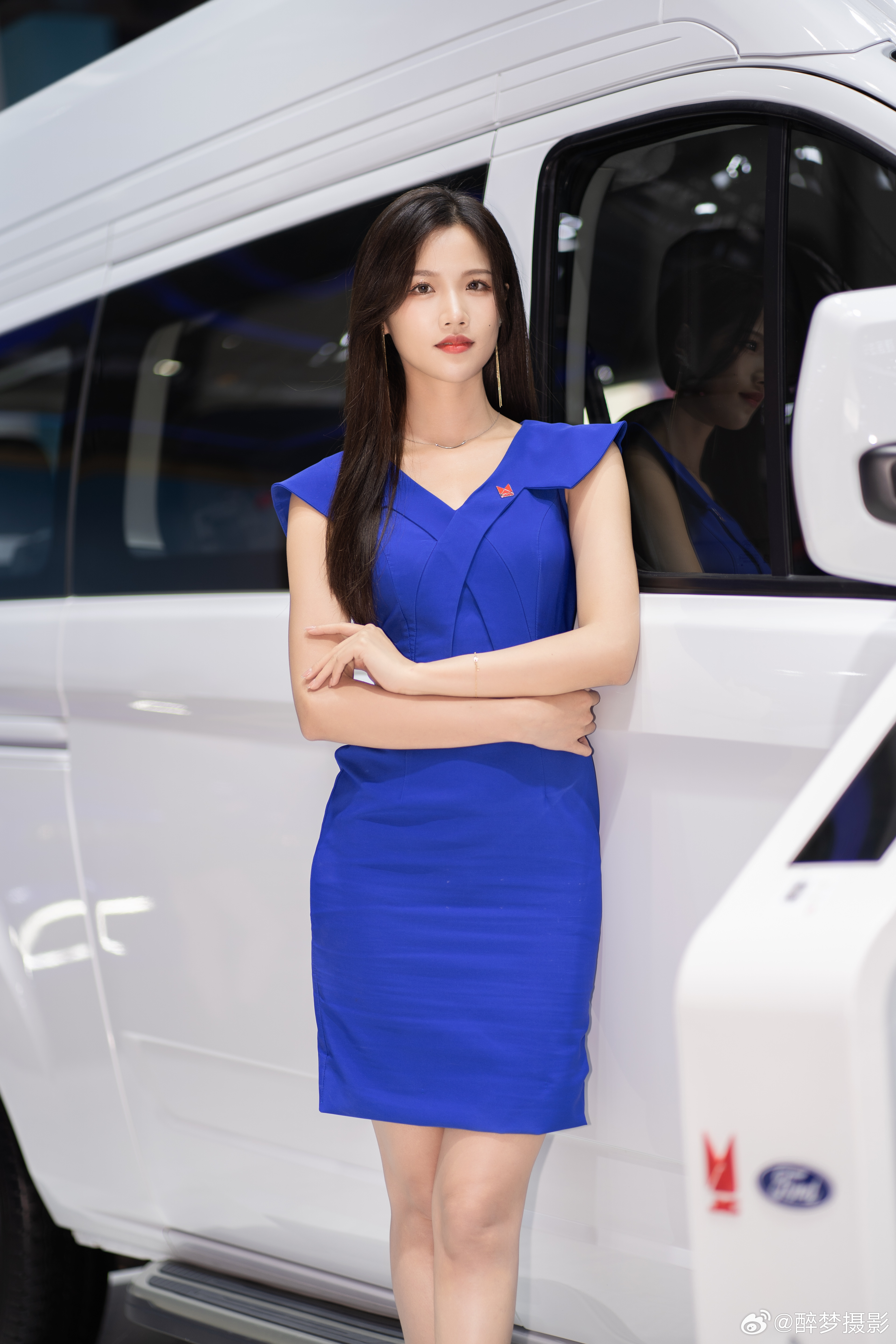 好看的福特小姐姐,她身穿宝蓝色修身连衣裙。