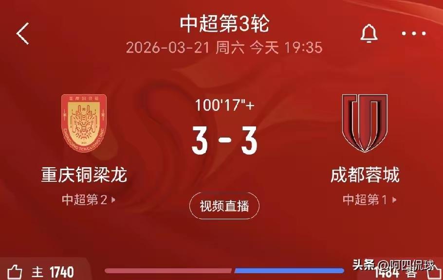 拜天、拜地、拜合拉木!拜合拉木成都蓉城开胡,成渝德拜合拉木补时打进绝平球!比赛补时4分钟,罗慕洛开角球,韦世豪后门柱头球攻门,球打到拜合拉木身上弹入球门!成都蓉城3比3绝平重庆铜梁龙,国足“福星”拜合拉木运气真的太好啦!这个球功劳99%是韦世豪的,但是算拜合拉木进球,拜合拉木到成都蓉城真的又成“福星”了!恭喜拜合拉木打进2026中超成都蓉城第一球! 本场川渝德比太火爆🔥太精彩了!成都蓉城韦世豪点球打破僵局,席尔瓦世界波把比分扩大到2比0,成都蓉城上半场2比0领先,想不到下半场风云突变,重庆铜梁龙像打了鸡血一样奋力反击,重庆铜梁龙连进3球3比2反超比分,还以为首次德比成都蓉城要以失败告终了,没想到补时韦世豪头球助拜合拉木绝平,全场比赛结束:重庆铜梁龙3比3成都蓉城,两队握手言和皆大欢喜!成都蓉城和重庆铜梁龙一起雄起[赞][赞][赞]