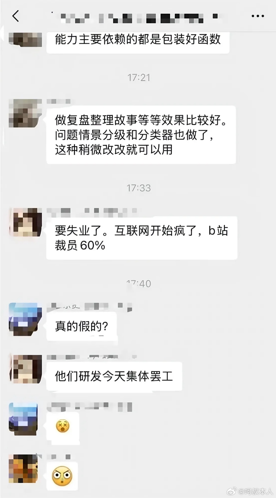 网传B站裁员60%研发集体罢工我觉得这是传的夸大了,B站员2万人,一下裁这么多核心业务(主站、直播、游戏、OGV)直接就瘫痪了,服务器运维、内容审核根本扛不住这规模的裁员,研发罢工如果真罢工,B站App、服务器、内容更新就崩了,也没见有啥异常不就证伪了吗?再说了,到现在光是几个聊天截图,没有一个B站员工出来发声,十有八九都不对劲……