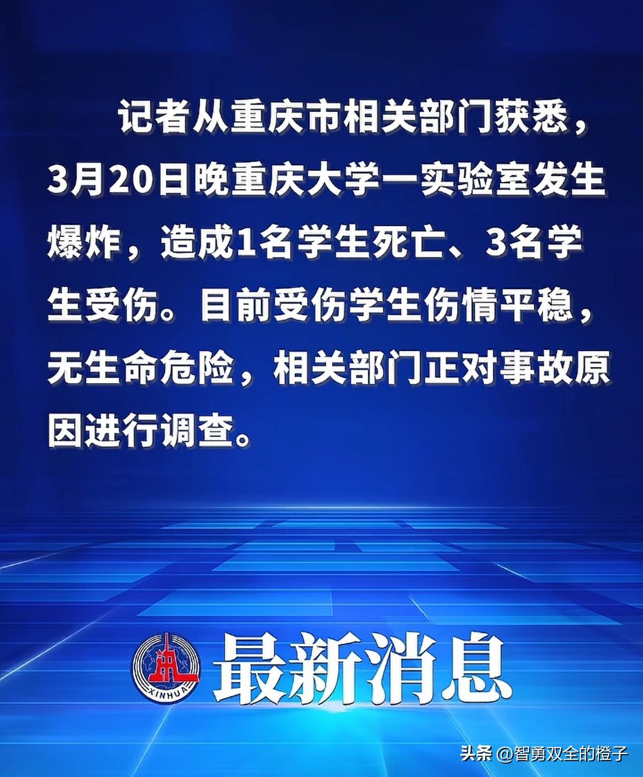重庆大学一实验室发生爆炸,造成学生1死3伤,现场画面流出,知情人士透露更多! 3月20日,晚上7点左右,重庆大学材料学院电子显微镜实验室发生爆炸,从现场画面可以看到,柜子和设备都有损坏,墙上的牌匾也掉在地上,很混乱。 据一名本校的学生说,事故发生在虎溪校区,当时他就在图书馆,实验室在图书馆的负一楼,他听到很大的一声,没过一会儿,就来了很多消防车和救护车。 后来下楼才知道,声音是从电镜实验室传来的,那个时间还在做实验的应该是研究生,本科生一般不会去那里。 太可惜了,重庆大学是985大学,算是很好的学校了,父母培养也不容易,希望能尽快调查清楚原因,给父母一个交待!