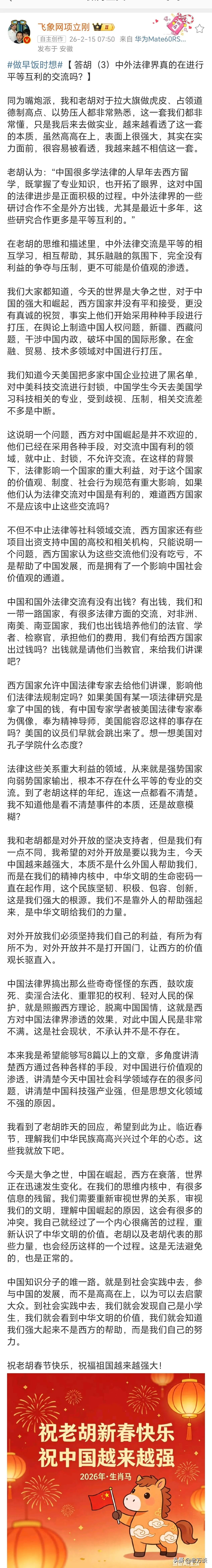 项立刚当初怒怼胡锡进,接二连三怒怼胡锡进,胡锡进都没有再反驳了,究竟是不想反驳,还是反驳不了呢!作为新闻媒体从业者,能说会道应该是最基本的素养,胡锡进不应该就这样偃旗息鼓了,必须与项立刚好好辩一辩啊!究竟是谁更在理,也好让大家做个评判,不说话,容易让人觉得自己理亏!胡锡进主编有空回应一下项立刚几次的反驳之词。中外法律界真的是平等互利交流吗?两个人都不是法律从业者,胡锡进是媒体从业者,接触的法律工作者更多,项立刚接触的应该要少很多,毕竟不是搞媒体的!