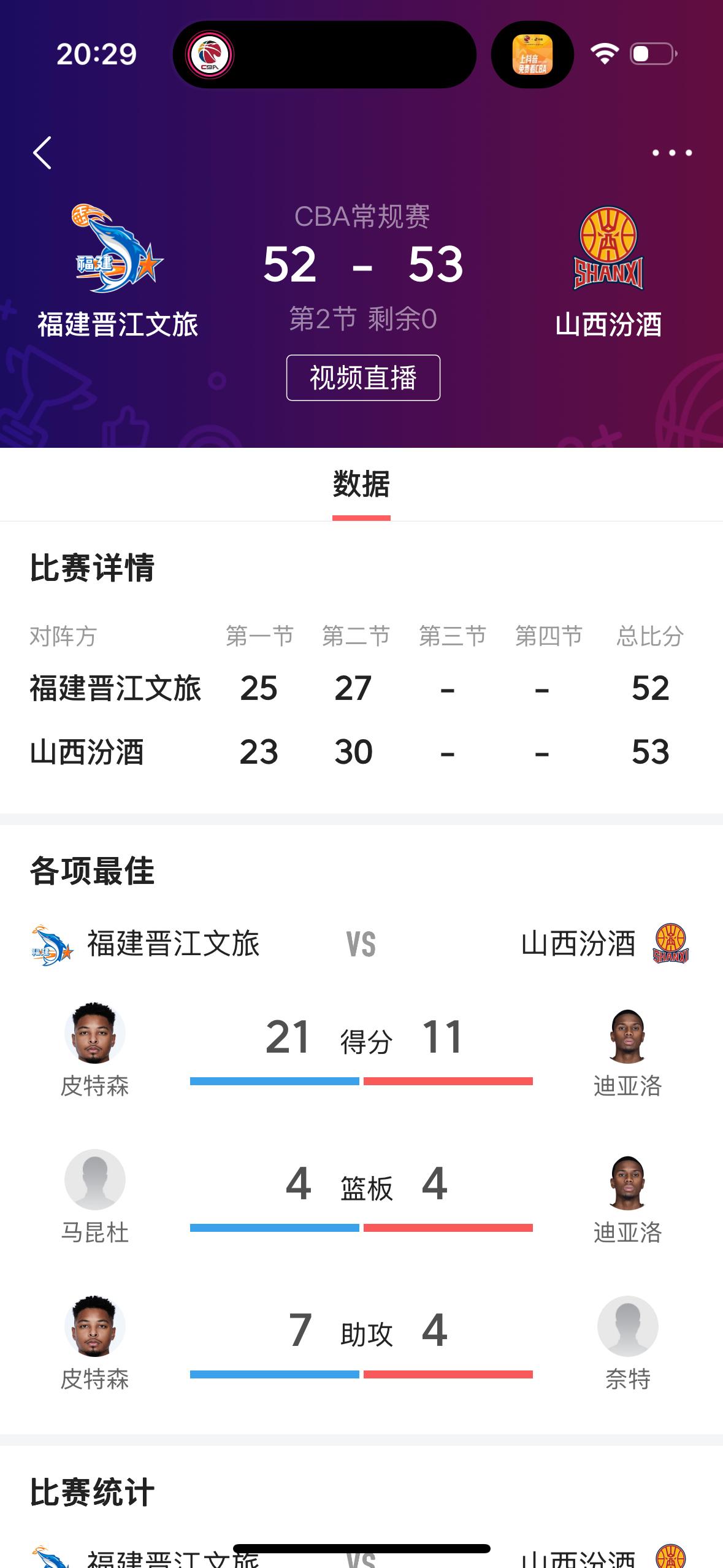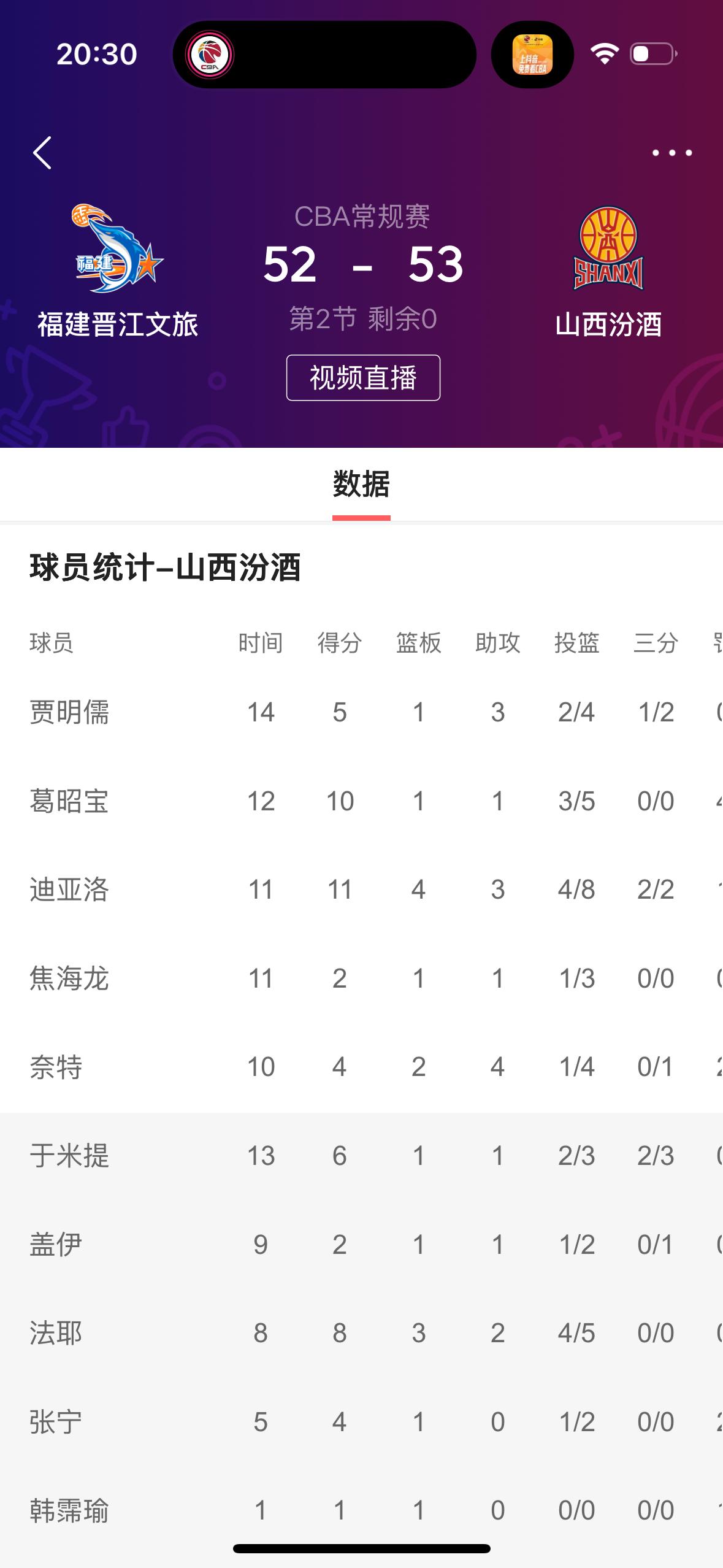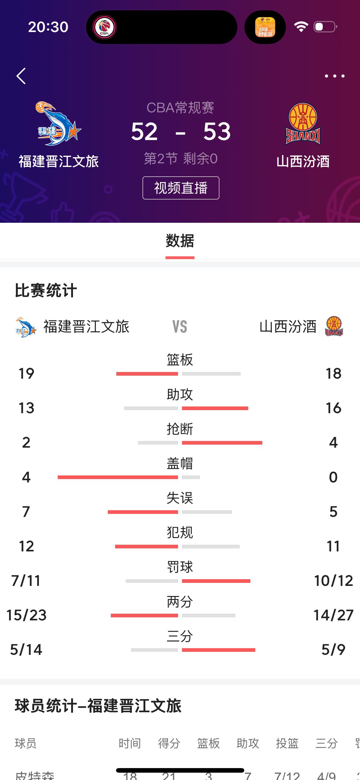 真的是没有想到,福建男篮会打得这么好! 在刚刚结束的福建晋江文旅男篮主场迎战山西汾酒男篮的上半场比赛中,福建队暂时以52753落后一分。 纵观全场比赛,福建队还是皮特森表现非常出色,一人独得21分,而且还有3篮板7助攻。反观山西队只有两名球员得分上双,分别是迪亚洛和大宝。 福建男篮最近取得三连胜!难道还是会取得四连胜吗?我相信!