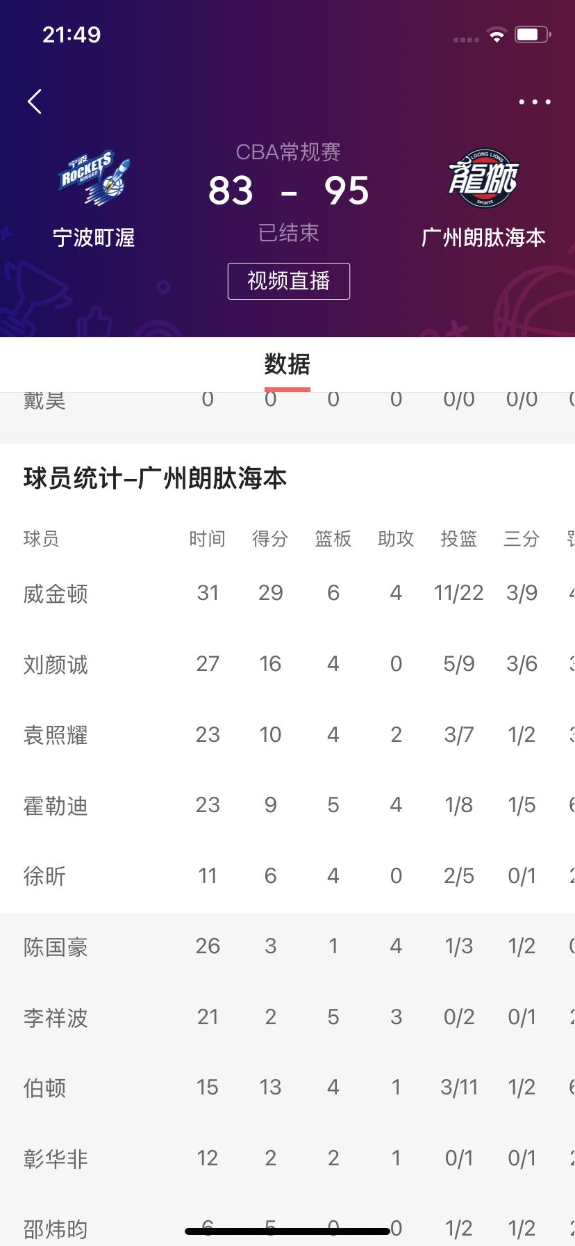 广州朗肽海本男篮客场挑战成功,战胜了宁波盯渥男篮。 在刚刚结束的广州男篮客场挑战宁波男篮的比赛,最终广州男篮以95比83取得了胜利✌️! 这场比赛中,广州队四名球员得分上双,威金顿29分6篮板4助攻。反高宁波队两个外援得分上20分,但是其他国内球员没有出色的表现。 恭喜广州朗肽海本男篮客场取得胜利✌️!