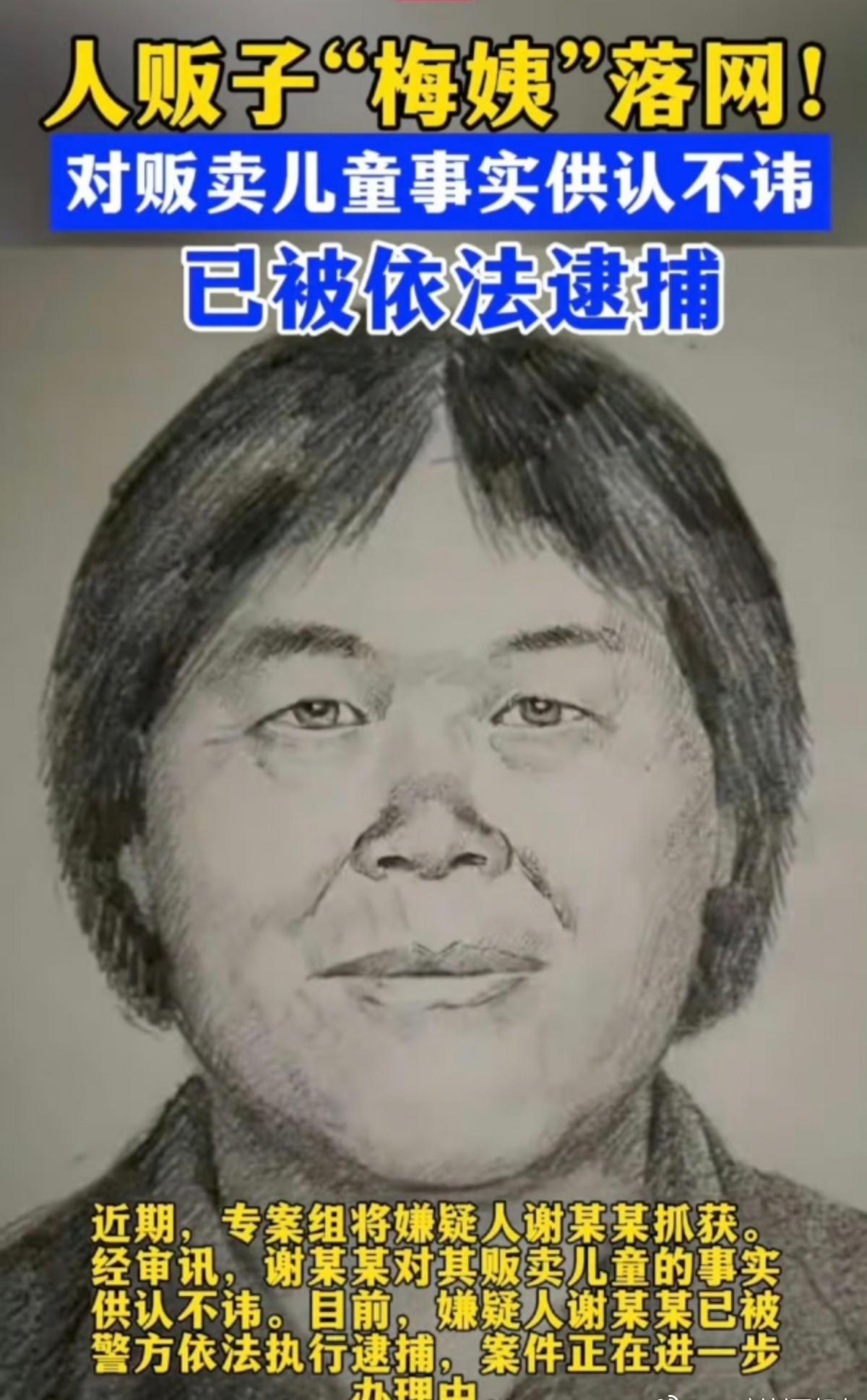 大快人心啊,总算抓到了。 一个残害了无数家庭的人渣,一定要受到法律的严惩。 我还是在另外一个平台关注到了寻亲家庭的,最开始看到了孙海洋,申军良他们,一路寻子,他们找了十几年总算找到了自己的孩子,但还有好多好多寻子家长还在路上。 希望能把世界上的“梅姨”扼杀在摇篮里,让孩子能够幸福的生活着,再也不会有拐卖,再也不会有买卖。
