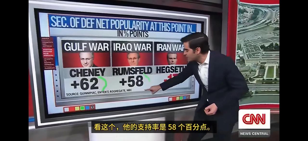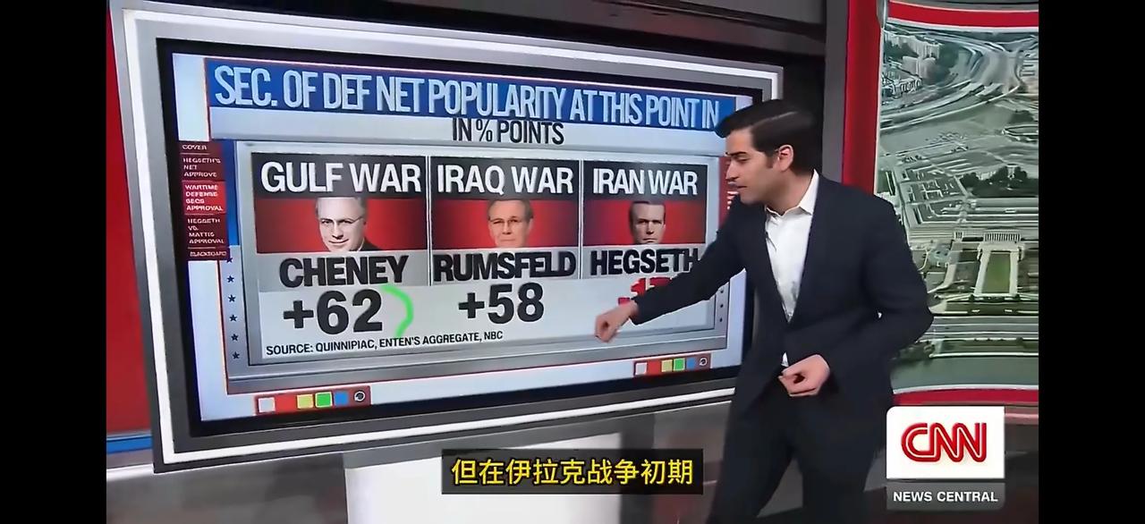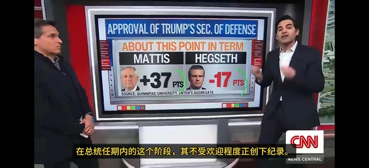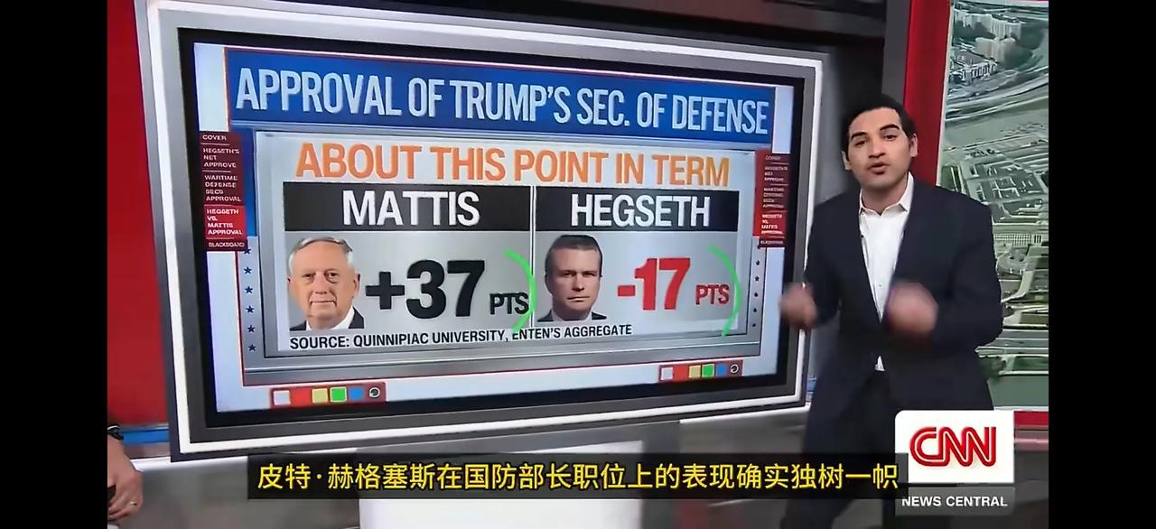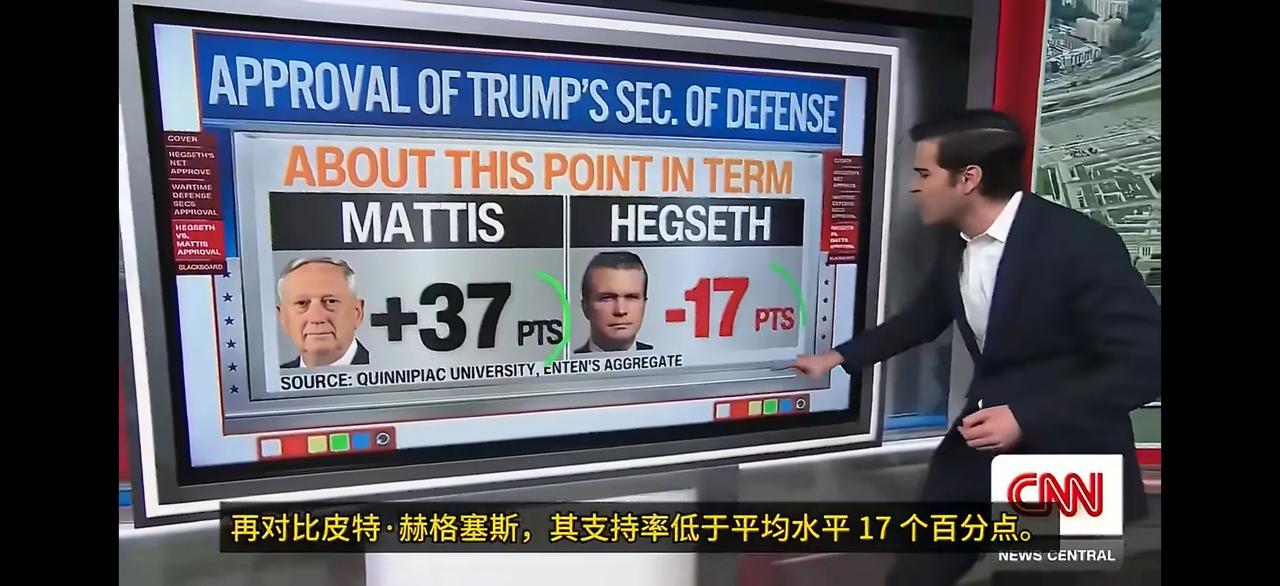 美国国防部长赫格塞斯打破了之前几届美国国防部长在战时支持率最低的纪录,其支持率在17%以下。 有意思的是,老特任期内的国防部长支持率都不咋滴,之前的马蒂斯也只有37%,但也超过赫格塞斯一倍还多。