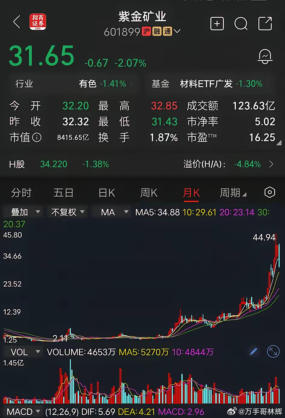 2025年的年报净利润是550亿,创历史新高。紫金矿业的主营业务就是,挖掘精炼金矿,业绩暴涨的主要原因就是2025年金价暴涨导致利润暴增。中国有句古话,君子不立危墙之下。紫金矿业的股价这次最高是44.94元,相比2块1毛1,短短几年时间涨了将近22倍,会不会是紫金矿业历史最高价了?因为接下来的几年里,金价肯定会有所回落,净利润肯定会下降,目前的股价是31块钱,相比高点,紫金矿业这次也套了不少人。