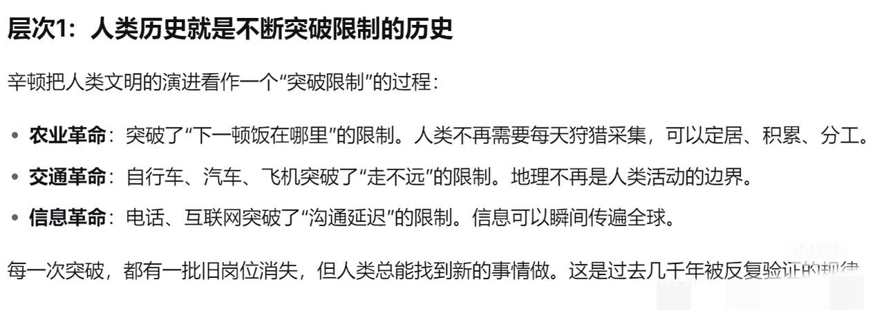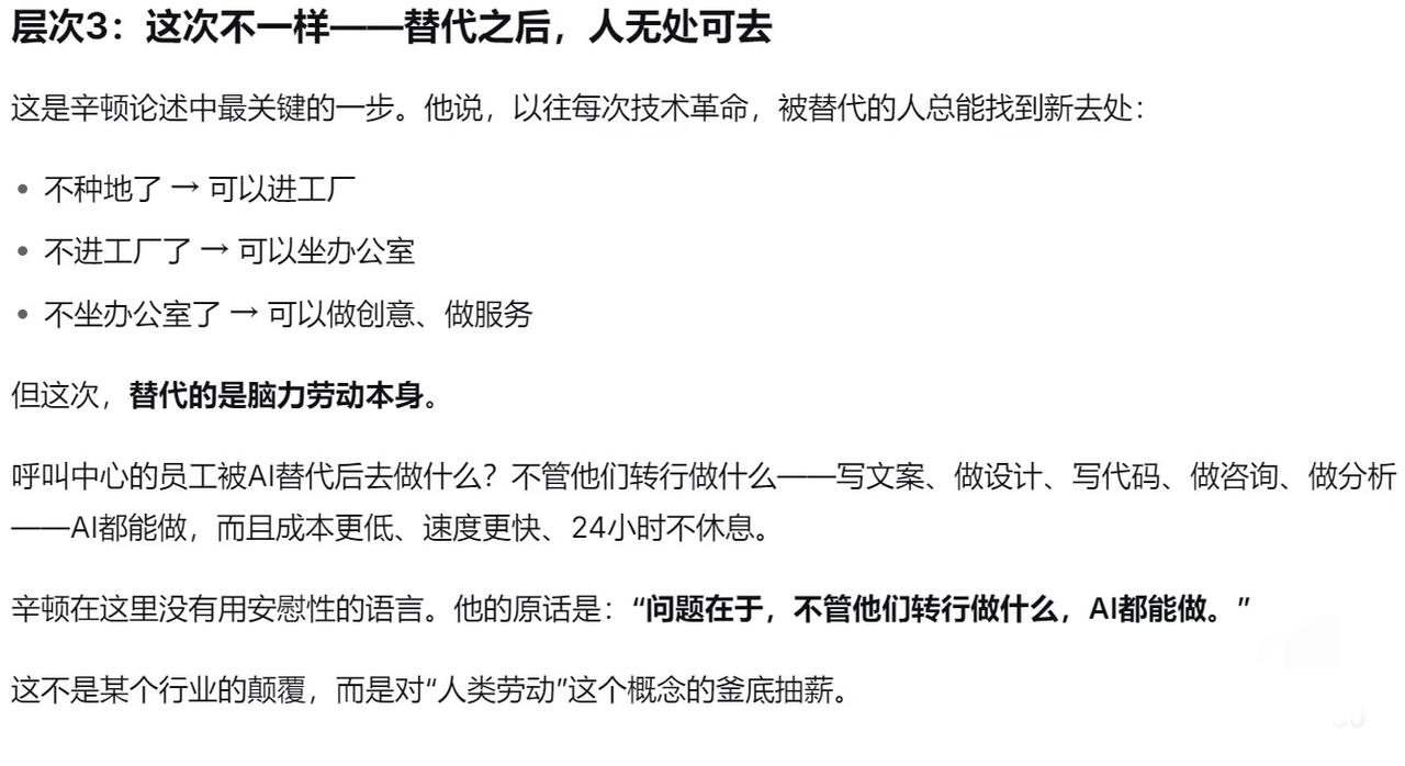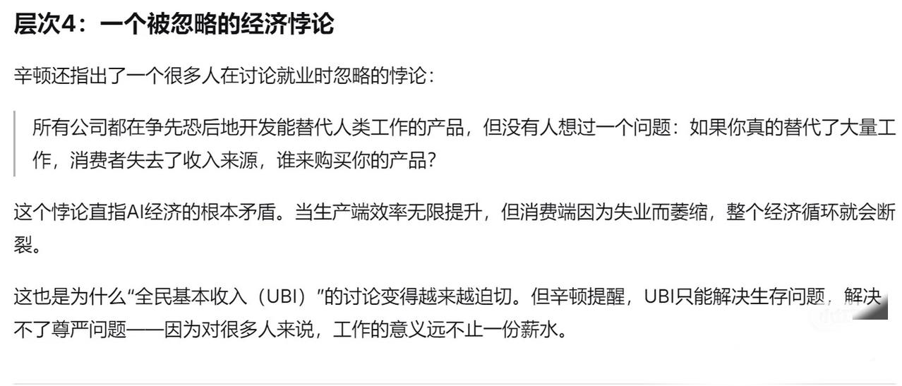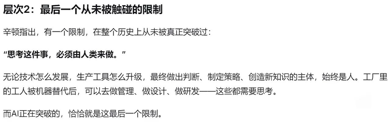 AI时代,工作被替代不可怕,可怕的是找不到存在的意义。就像辛顿说的,以前技术革替代的是手脚,现在要动的是脑子。可再智能的AI,也学不会人在劳动里找到的尊严。或许未来,我们该学的不是对抗变化,而是在变化里找到新的价值。