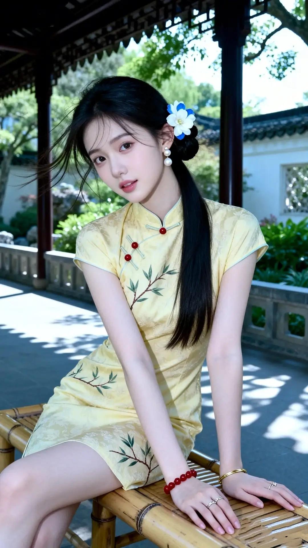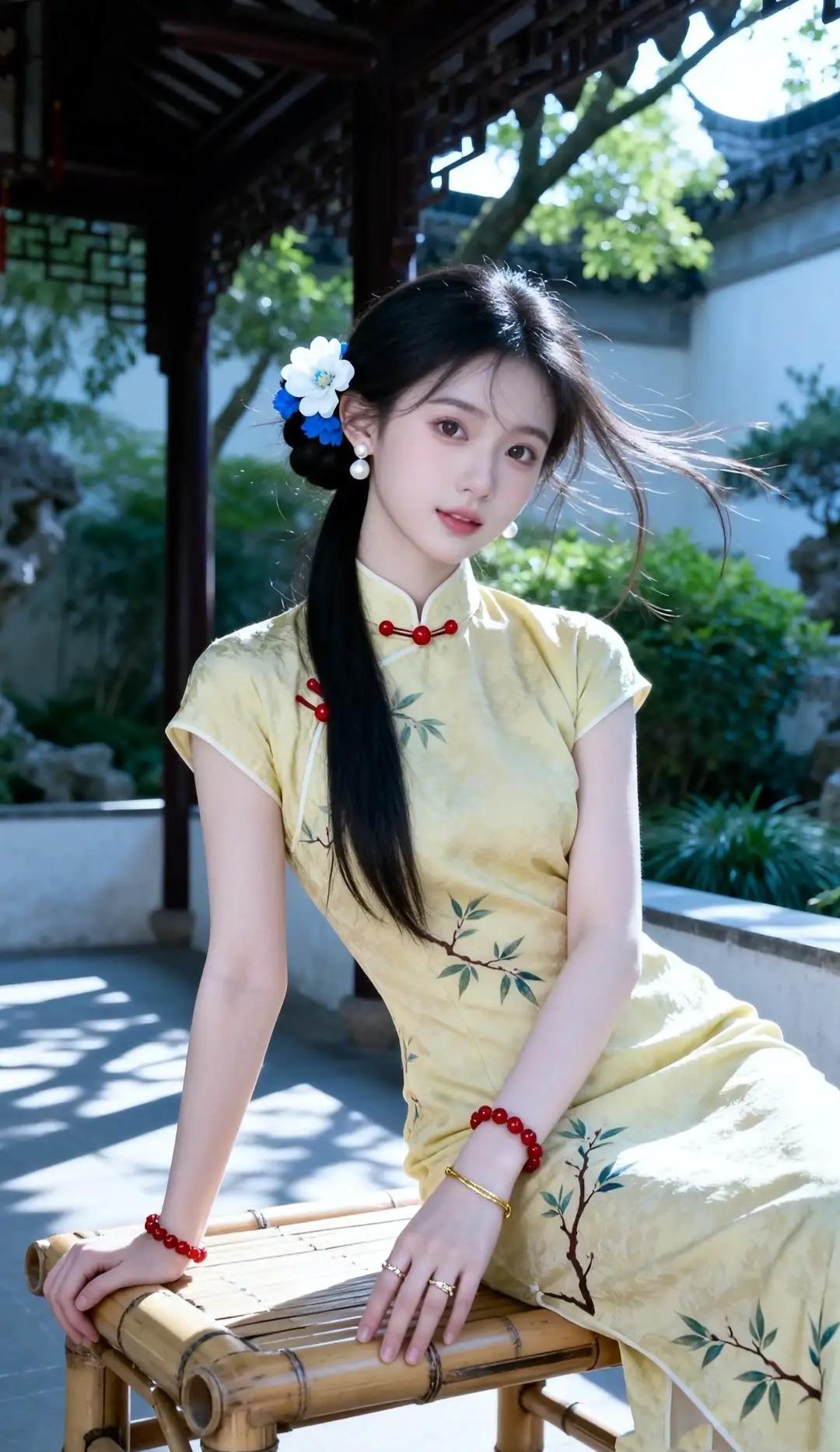 画面中的女子身着淡黄色短款旗袍,面料温润,暗纹雅致,领口处红色盘扣与枝叶刺绣相映成趣,清新又灵动。修身剪裁勾勒出曼妙身姿,短袖设计露出纤细手臂,娇俏可人。 乌黑的长发松松挽起,发间别着一朵蓝白相间的花饰,珍珠耳坠点缀耳畔,眉眼清澈,唇色嫣然,气质温婉又灵动。她坐在江南园林的竹椅上,背景是黛瓦白墙、绿树浓荫,光影斑驳间,她或回眸浅笑,或轻倚竹椅,姿态优雅,一颦一笑皆是风情,宛如从江南烟雨中走出的少女,清新脱俗,美得恰到好处。
