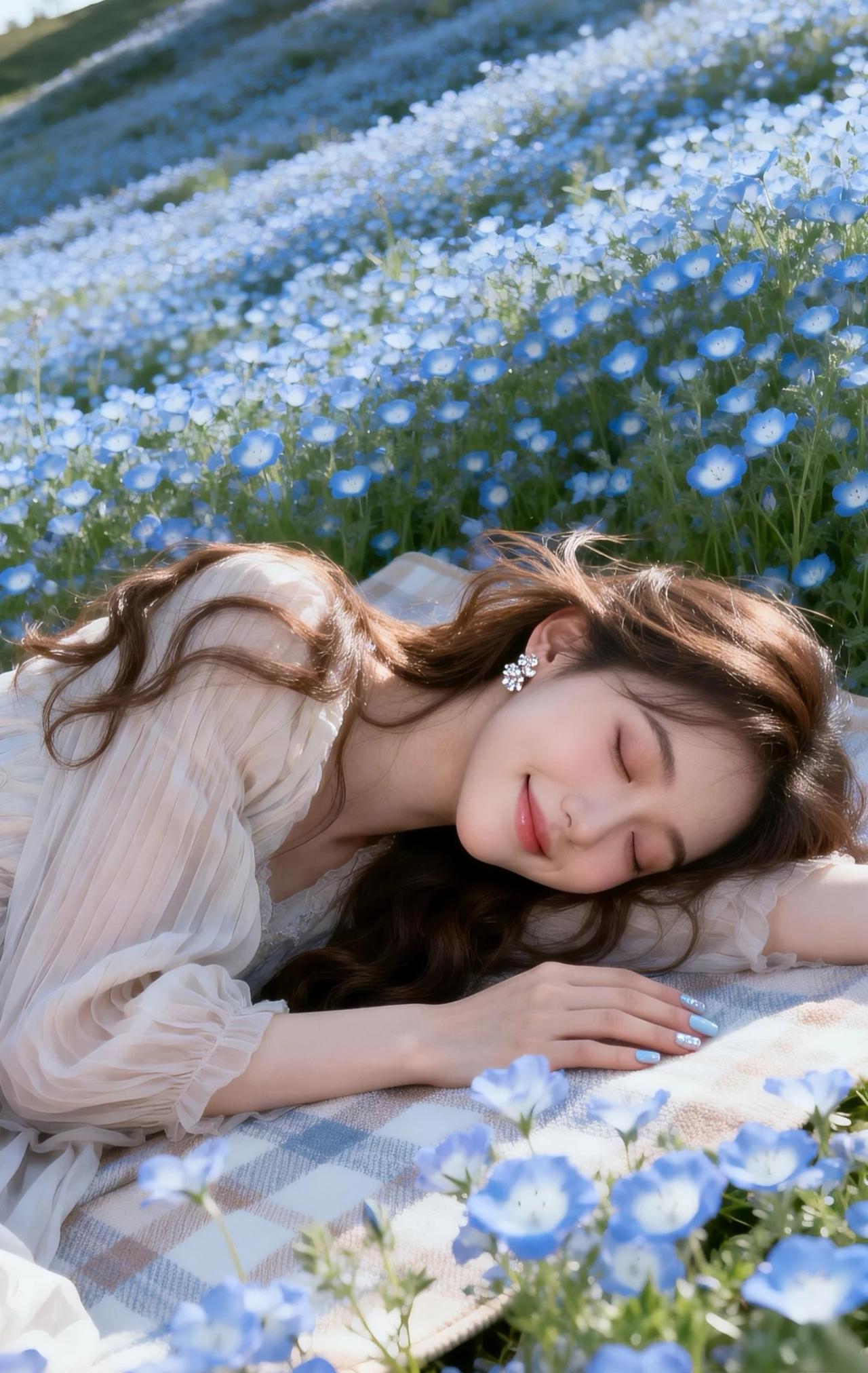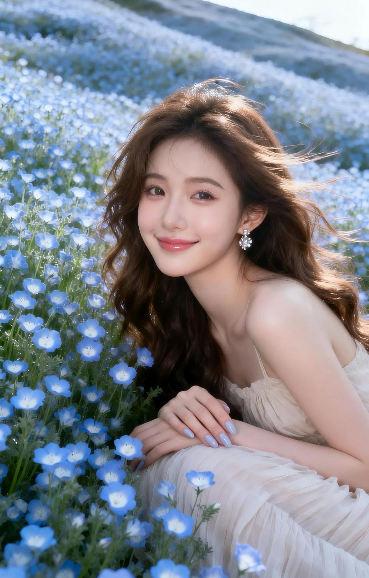 这组照片宛如坠入了一片梦幻的蓝色花海,满是春日的温柔与浪漫。 画面中的女子身着一袭浅杏色吊带纱裙,轻盈的面料随风轻扬,褶皱设计灵动飘逸,尽显仙气。一头慵懒的棕色卷发自然垂落,发丝随风轻舞,搭配精致的钻石耳饰,眉眼弯弯,笑容清甜,肌肤白皙透亮,气质温柔又灵动。 她置身于漫山遍野的蓝色喜林草花海中,蓝白交织的花浪层层叠叠,清新治愈。她或闭眼浅笑,或回眸凝望,或轻倚花丛,姿态慵懒又优雅,与这片蓝色花海融为一体,宛如误入人间的花仙子,美得如梦似幻,治愈又美好。