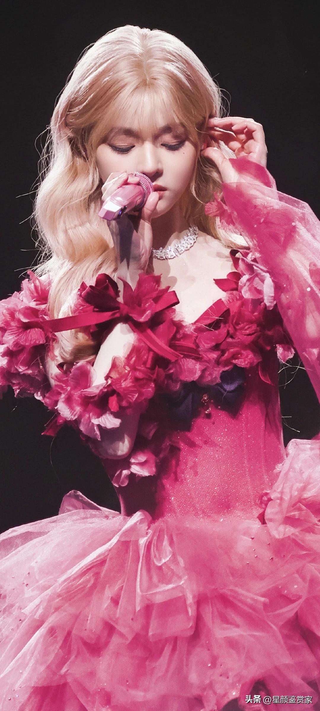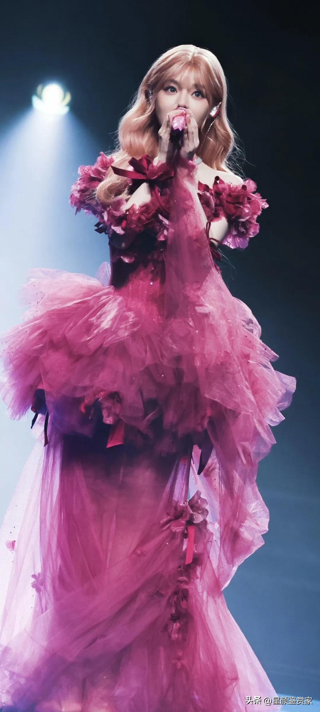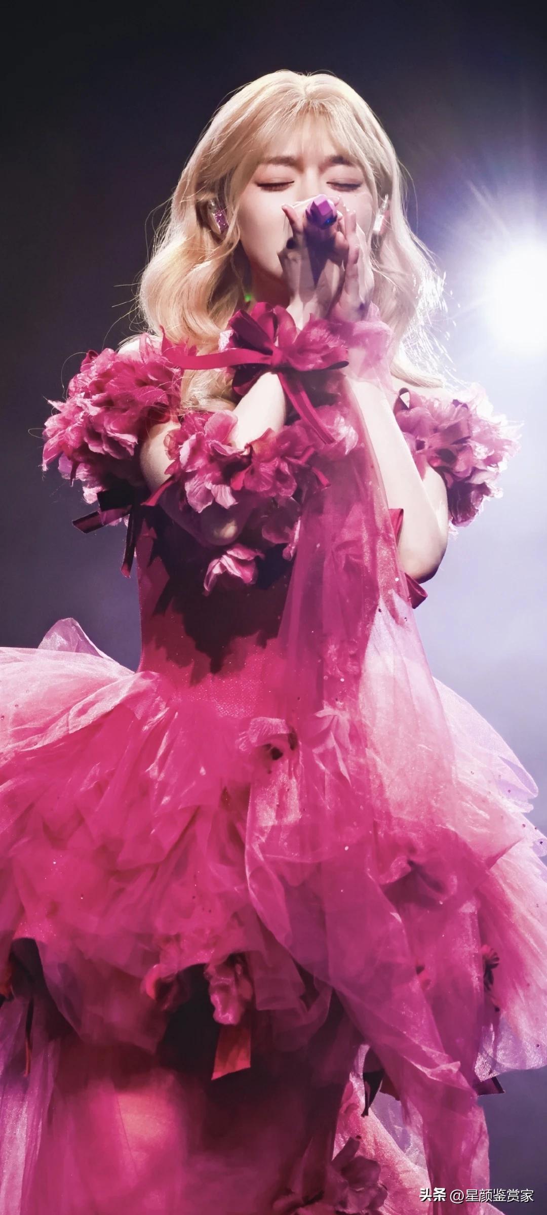 黄霄云舞台壁纸~ 她穿着玫红纱裙唱歌的样子,像个会发光的洋娃娃,真好看。