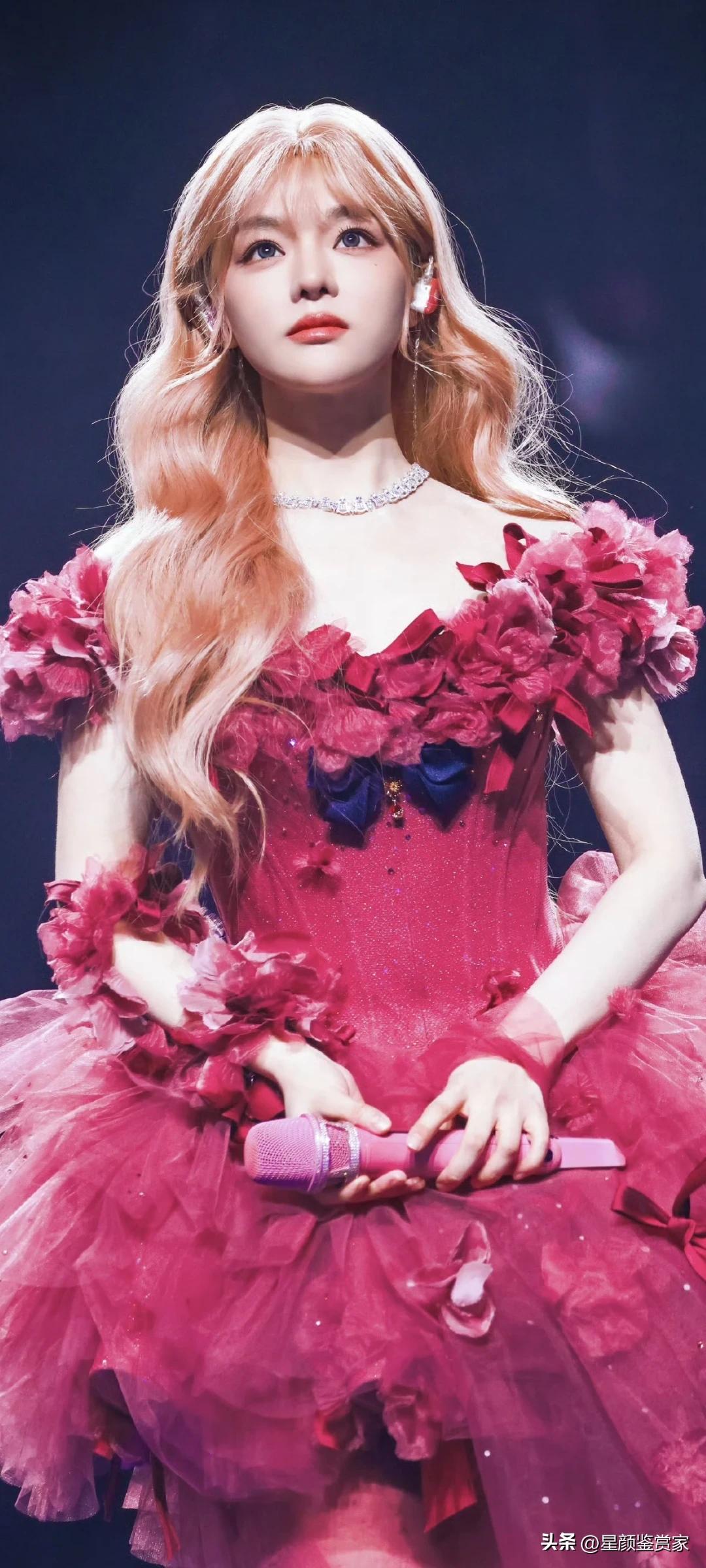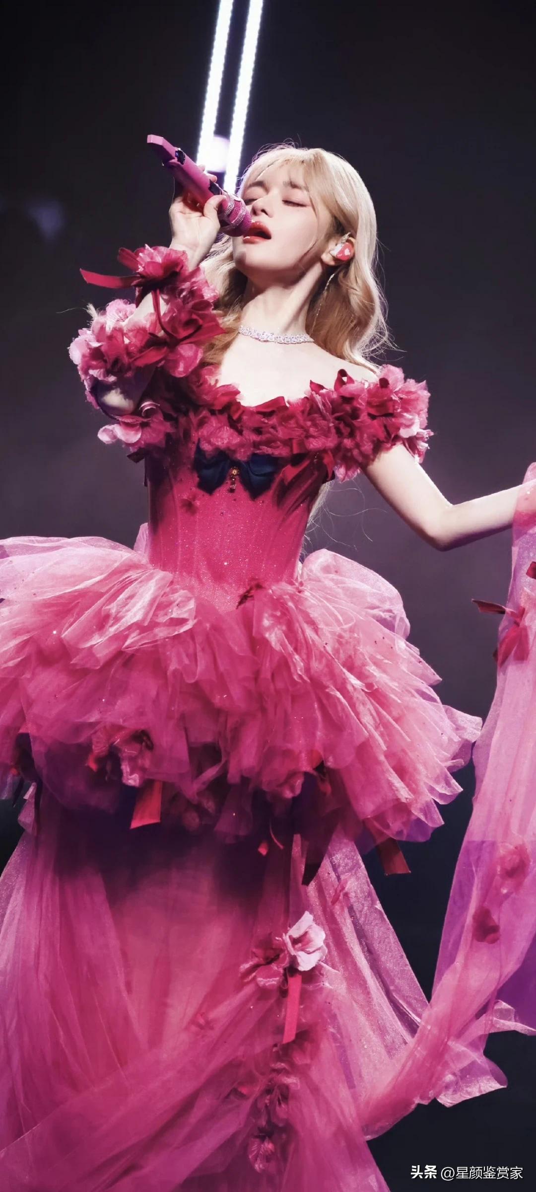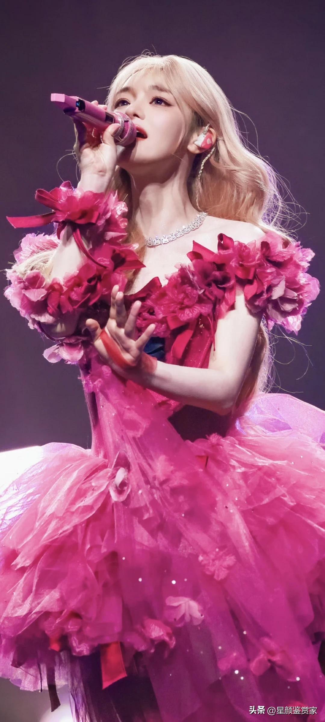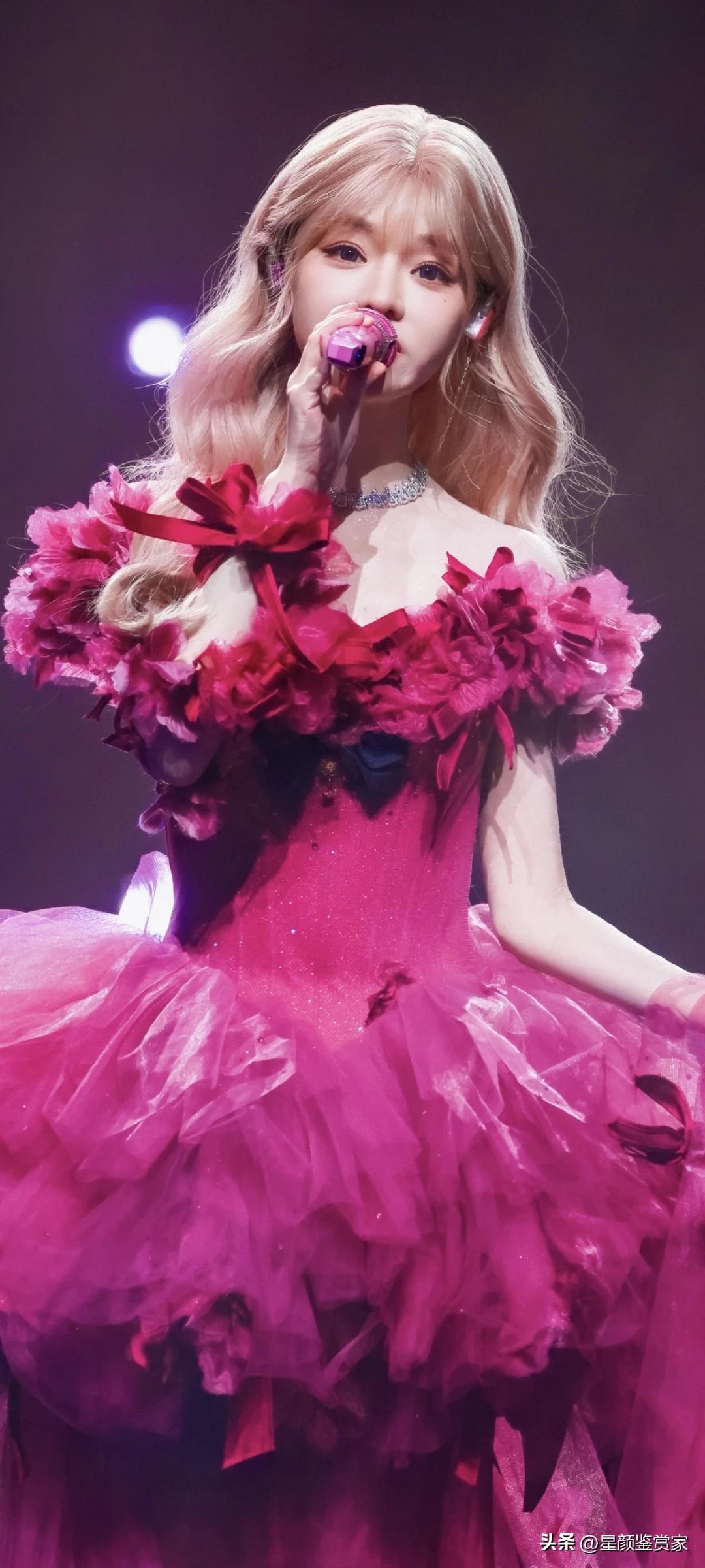 黄霄云舞台壁纸~ 她穿着玫红纱裙唱歌的样子,像个会发光的洋娃娃,真好看。