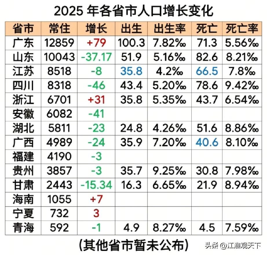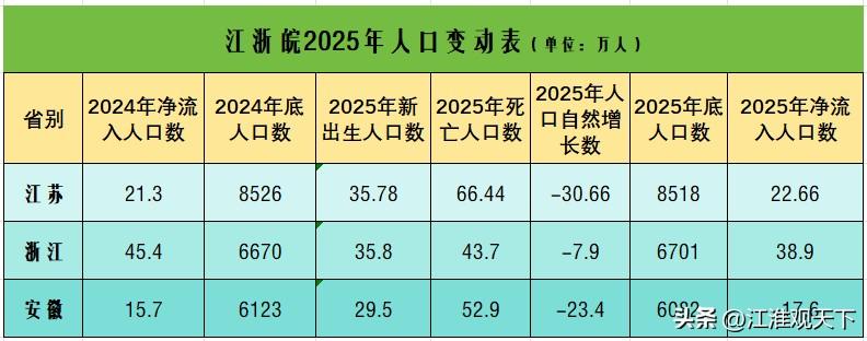 江苏实际流入22万人,浙江实际流入38万人,安徽实际流失17万人 长三角三省一市,除了上海市还没有公布2025年人口数据,江苏,浙江,安徽三省统计部门都已经公布出2025年的常住人口数据。 明面上看,江苏人口减少了8万人,浙江增加了31万人,安徽减少了41万人。 具体分析一下,苏浙人口都有流入,只有安徽人口是纯流出。 1.江苏省,2025年出生人口35.78万人,死亡66.44万人,死亡人数比出生人数多出30.96万人,实际流入22.96万人,全年人口比2024年减少8万人,总数据是8518万人。 2.浙江省,2025年出生人口35.8万人,死亡人数43.7万人,死亡人数比出生人数多7.9万人,实际流入38.9万人,总数据是6701万人。 3.安徽省,2025年出生人数29.5万人,死亡人数52.9万人,死亡人数比出生人数多23.4万人,实际流出17.6万人,总数据是6082万人。 综合来看,浙江省是人口纯流入地省份,流入31万人,江苏省死亡人数多,超66万人,拉低了流入人口数据,全年人口减少8万人。 安徽省是死亡人数多,超52.9万人,流失率也高。中国人口走势 人口数量分布图 全国人口流动 农村人口流出 人口净流入省份 安徽籍人口迁入 湖南人口流出