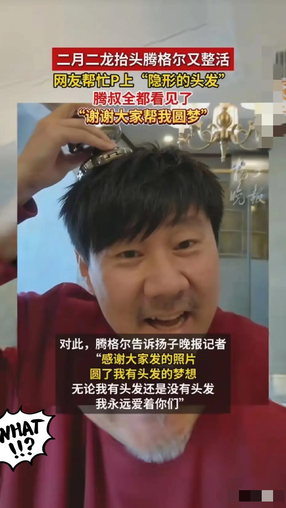 林俊杰万万没想到! 腾格尔更没料到! 网友送的一顶假发,直接让两位歌王送上 热搜,全网玩梗玩到停不下来,这波梦幻联动也太欢乐了!二月二龙抬头腾格尔拍视频剃“隐形头发”,魔性画面逗乐网友,反手就给他P上林俊杰同款浓密刘海,戴上假发的腾叔瞬间撞脸JJ,相似度直接拉满,连本尊看了都忍不住笑出声。 林俊杰常年因同款刘海被质疑戴假发,还曾直播激动澄清头发是真的,这下被腾格尔跨界撞款,反倒大方接梗,一点明星架子都没有。草原歌王接地气陪网友玩梗,华语唱将轻松应对趣味调侃,没有尴尬只有欢乐,这份松弛感真的太圈粉了。其实明星和网友的互动本就该这样,不端着不较真,简单的快乐最能戳中人心。 真正的路人缘从不是靠硬凹人设,而是这份放下身段的真诚和幽默,既能让自己开心,也能给大家带来欢乐。你觉得这波假发梗里,腾格尔和林俊杰谁的反差感更戳你?