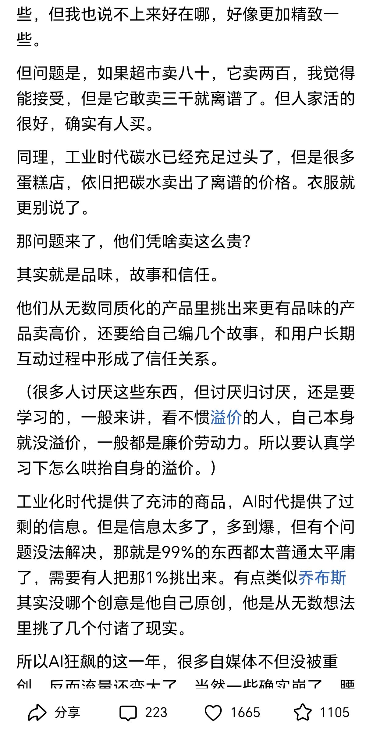 董宇辉把《额尔古纳河右岸》卖150万本 张雪峰贩卖高考、考研、考公的焦虑 作为普通人 我们能卖什么? 九边说,可以卖溢价 其实就是品味,故事和信任。 很多人讨厌这些东西, 但终究还是得学习一下 看不惯溢价的人, 自己本身就没溢价, 一般都是廉价劳动力。 所以要认真学习下 怎么哄抬自身的溢价 方得始终 品味 是你对生活、 对专业领域的独特见解和审美。 比如一个热爱摄影的人, 他不仅仅是会按快门, 更懂得构图、光线运用, 能拍出有故事、有情感的照片, 这就是他在摄影领域的品味体现, 能让客户愿意支付更高的价格。 故事 是你个人经历中那些能打动他人的片段 一个创业者, 分享自己在创业过程中 遇到的挫折、坚持和突破, 能让投资者看到他的坚韧和潜力, 从而更愿意投资他的项目。 这些故事就像是一个个钩子, 能勾住别人的注意力和信任。 信任, 是最难建立却又最有价值的。 要通过长期的言行一致、 专业可靠来赢得。 一个医生, 总是耐心倾听患者的诉求, 准确诊断病情, 给出有效的治疗方案, 久而久之, 患者就会对他产生信任, 愿意找他看病, 甚至会把他推荐给身边的人。 作为普通人, 我们要学会包装自己, 把自己的品味、故事和信任传递出去, 让更多的人看到我们的价值, 这样才能提升自身的溢价, 在这个竞争激烈的社会中 获得更好的发展。