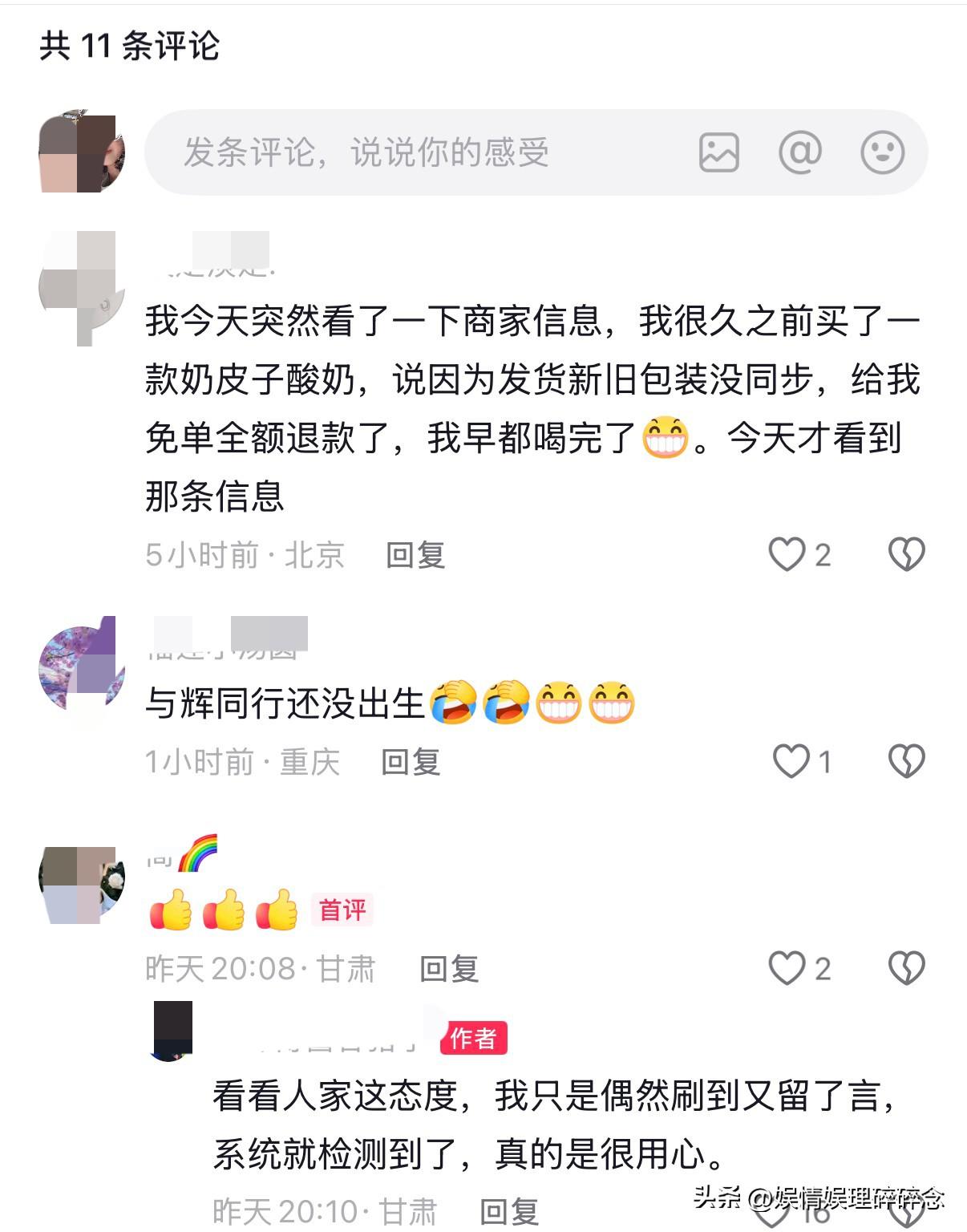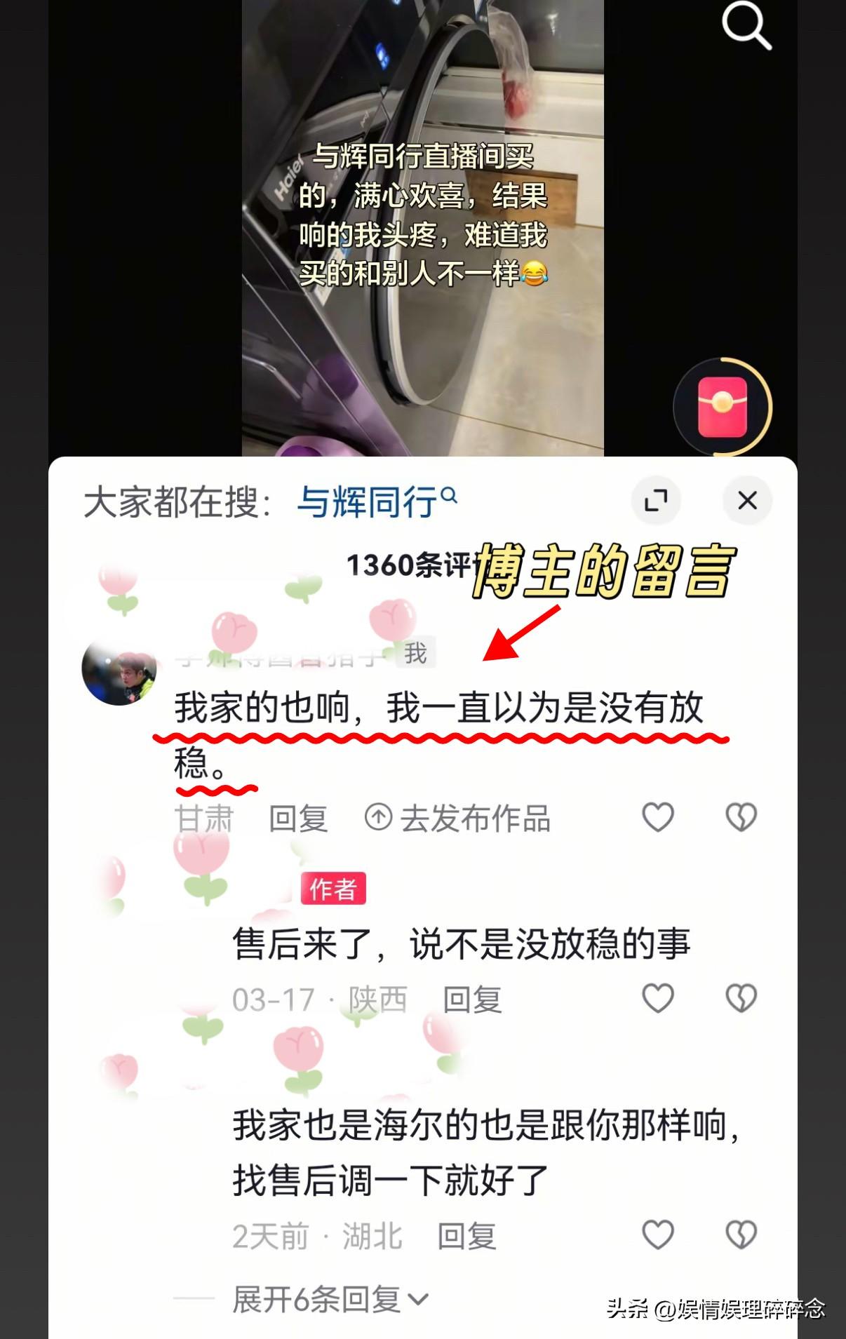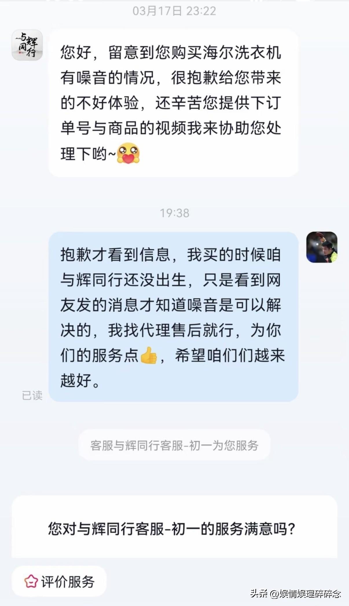 “与辉同行”的客服不得不服。 有博主在网上发了个视频,说自己在别人视频下的留言都被“与辉同行”的客服看到了,还主动联系了他,要帮他解决问题,结果却有点出乎意料。 这位博主看到有人发视频,说自己在“与辉同行”买的海尔洗衣机有异响,博主就在这条视频下留言,说“我家的也响”。 没想到,就这么一条留言,也被“与辉同行”的客服“逮着”了,发信息给他,让他提供订单号和商品视频来协助处理。 最后的结果让人哭笑不得,原来这位博主的洗衣机不是在“与辉同行”买的,而且买的时间还早于“与辉同行”成立的时间,用博主的话说,就是买的时候“与辉同行还没出生”。 一场乌龙,却藏着最真诚的用心。不是消费者找上门才处理,而是客服在一条不起眼的留言里,认出了自家产品的可能问题。哪怕只是“可能”,也要追过去问清楚。 网友对“与辉同行”的偏爱从不是无缘无故,这份信任,是每一次售后被认真对待,每一次留言被看见,每一次“可能有问题”都被追着解决——一点一点攒出来的。 董宇辉 与辉同行