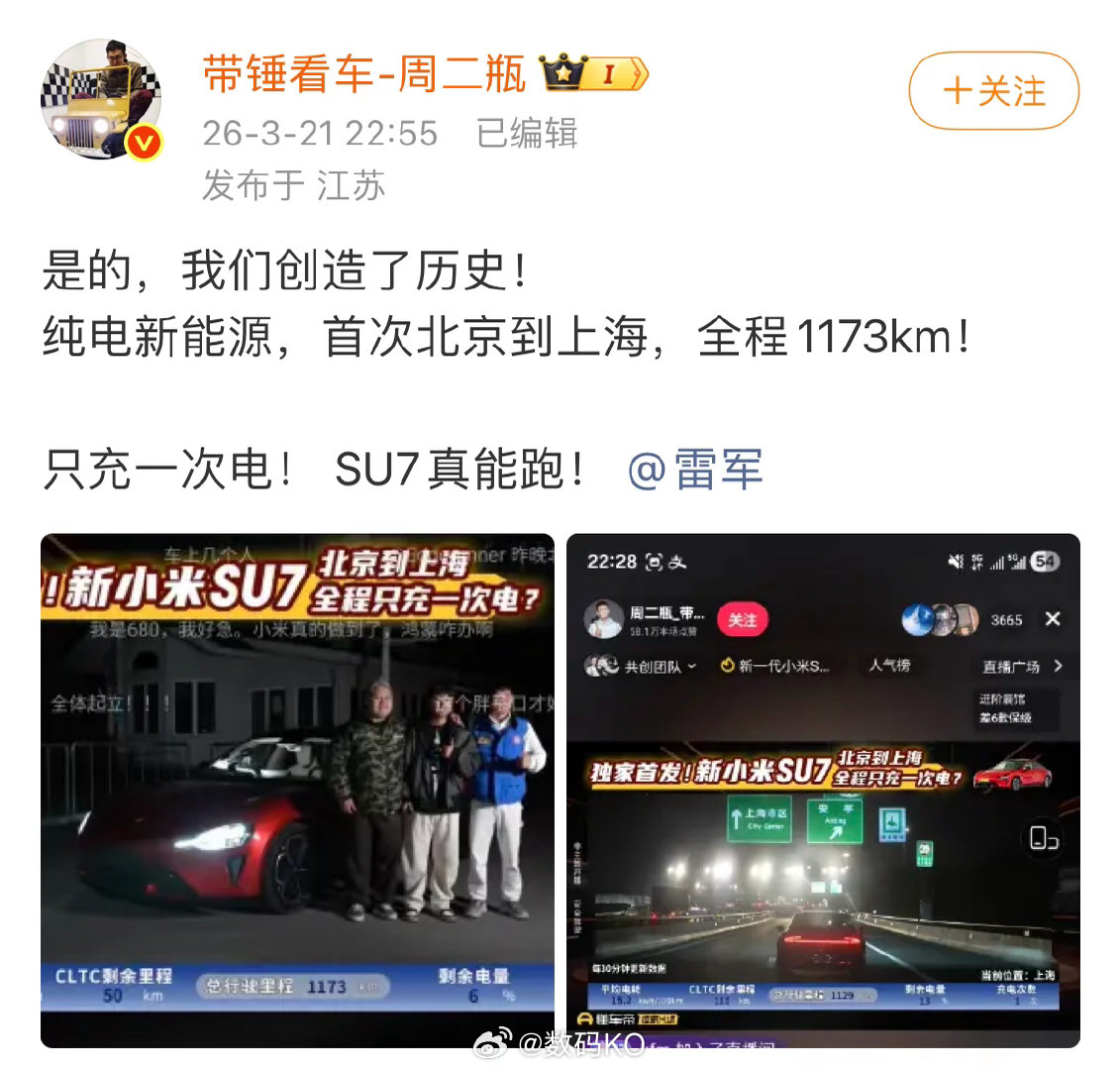 中间只充一次电,这以后怎么还让黑子怎么黑,直接变成现实了。新一代小米su7北京到上海,全程1173KM,剩余电量6%。