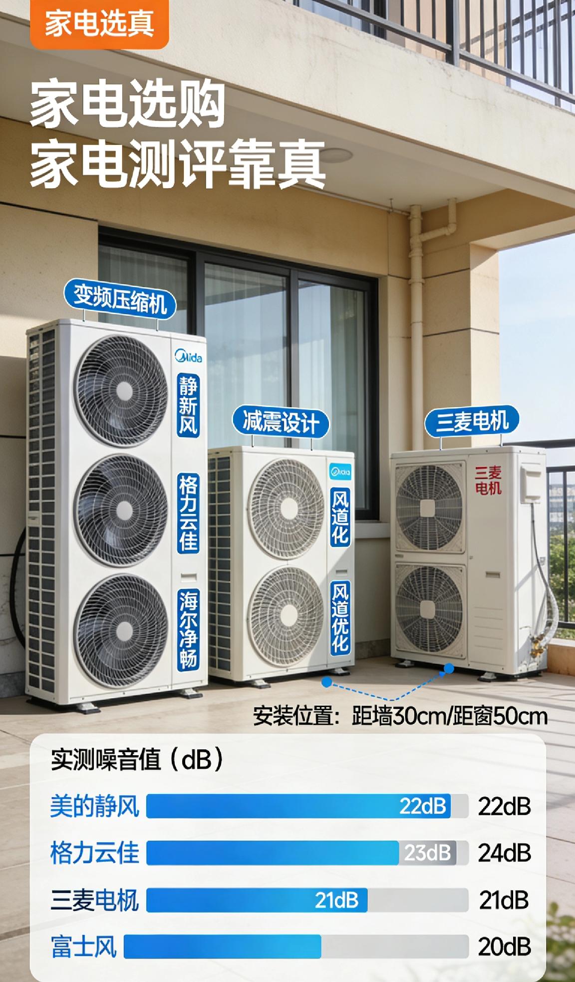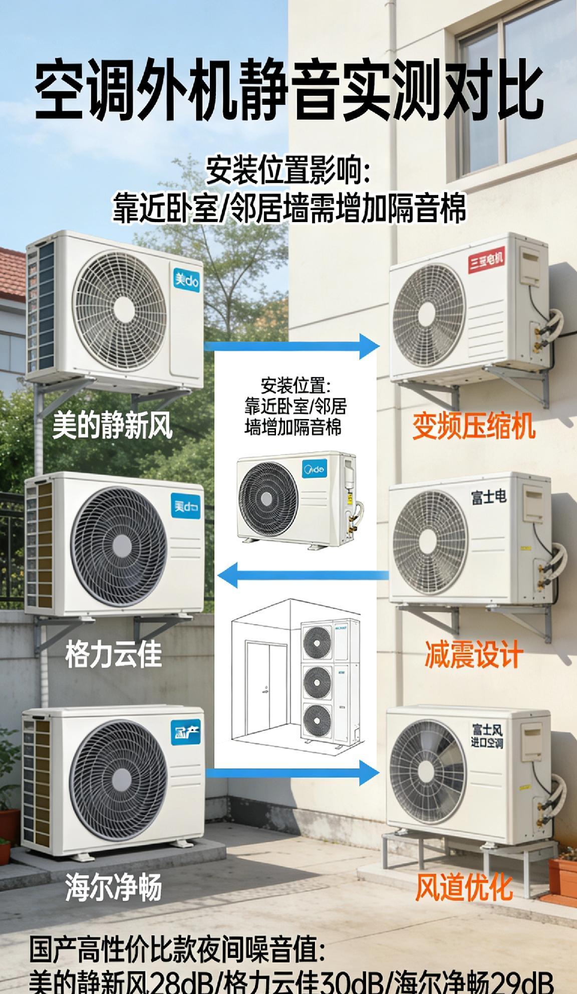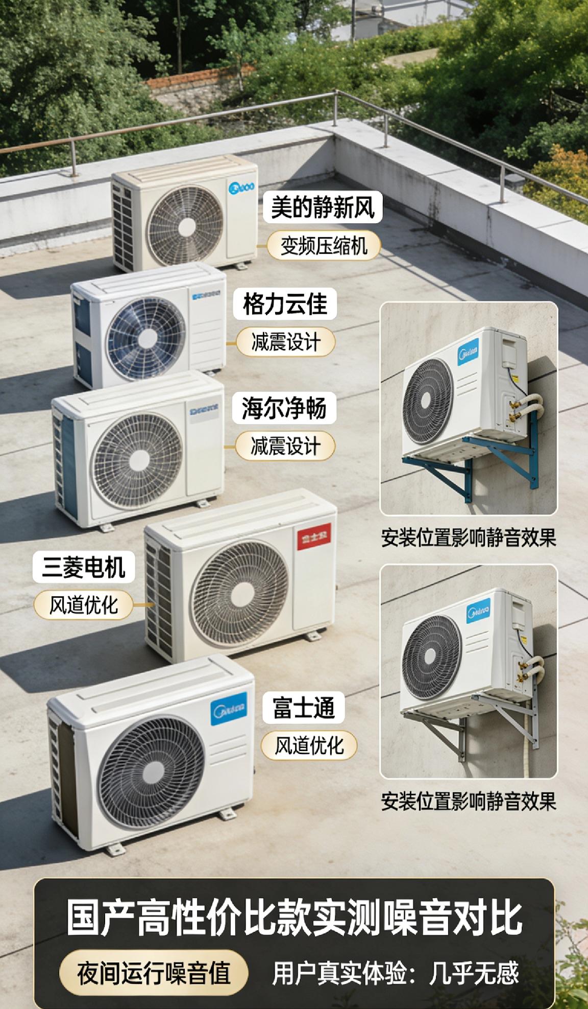 最近打算换新空调,最看重外机静音,怕吵到邻居也影响自家休息。 做了功课才知道,外机静音关键看变频压缩机、减震设计和风道优化。目前看了美的静新风、格力云佳、海尔净畅这些热门款,也听说三菱电机、富士通的外机静音表现更稳,但价格偏高。 想问问大家,国产高性价比里,哪款外机实测噪音最低、夜间运行几乎无感?安装位置会不会影响静音效果? 求真实使用体验,在线等推荐! 空调推荐 静音空调