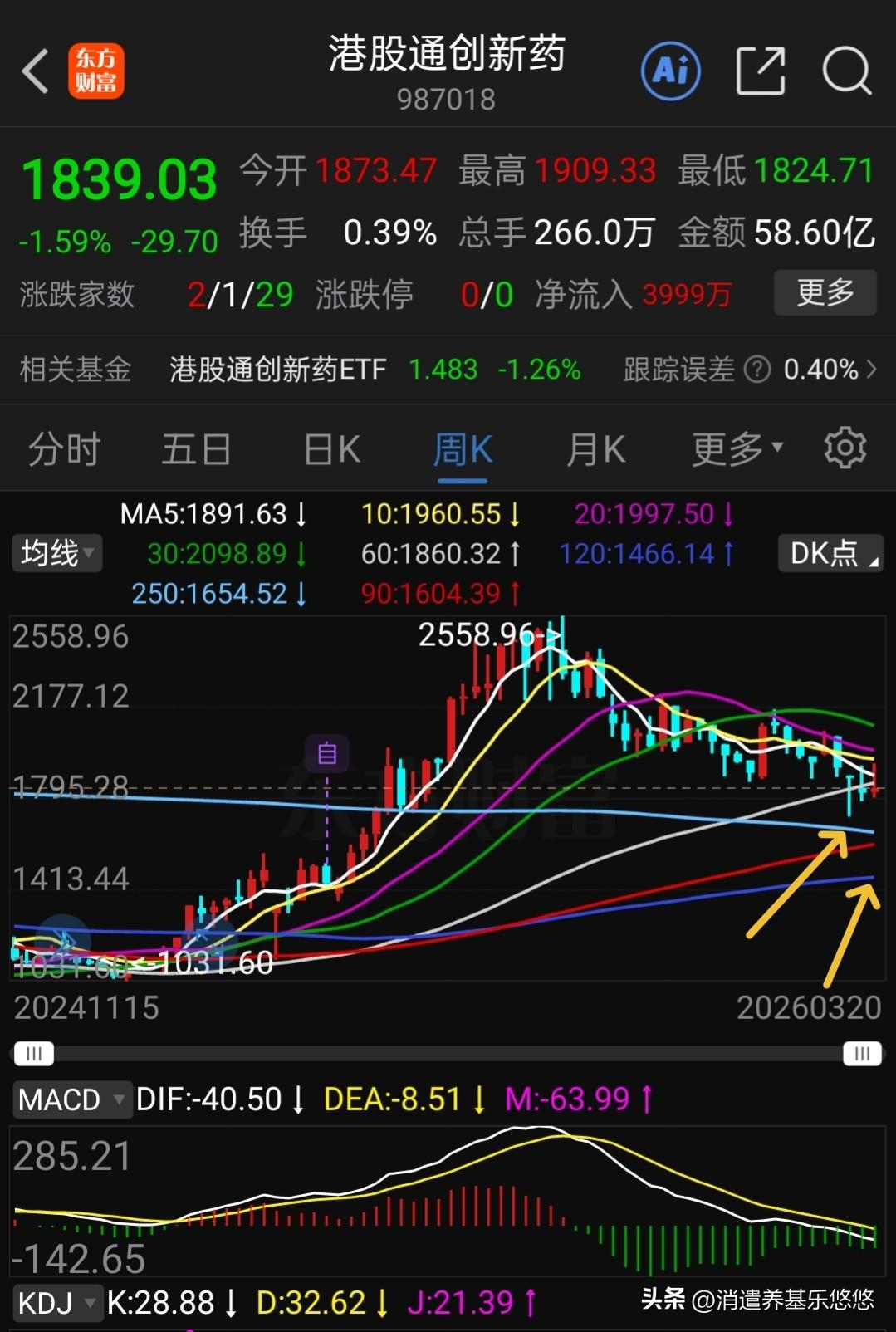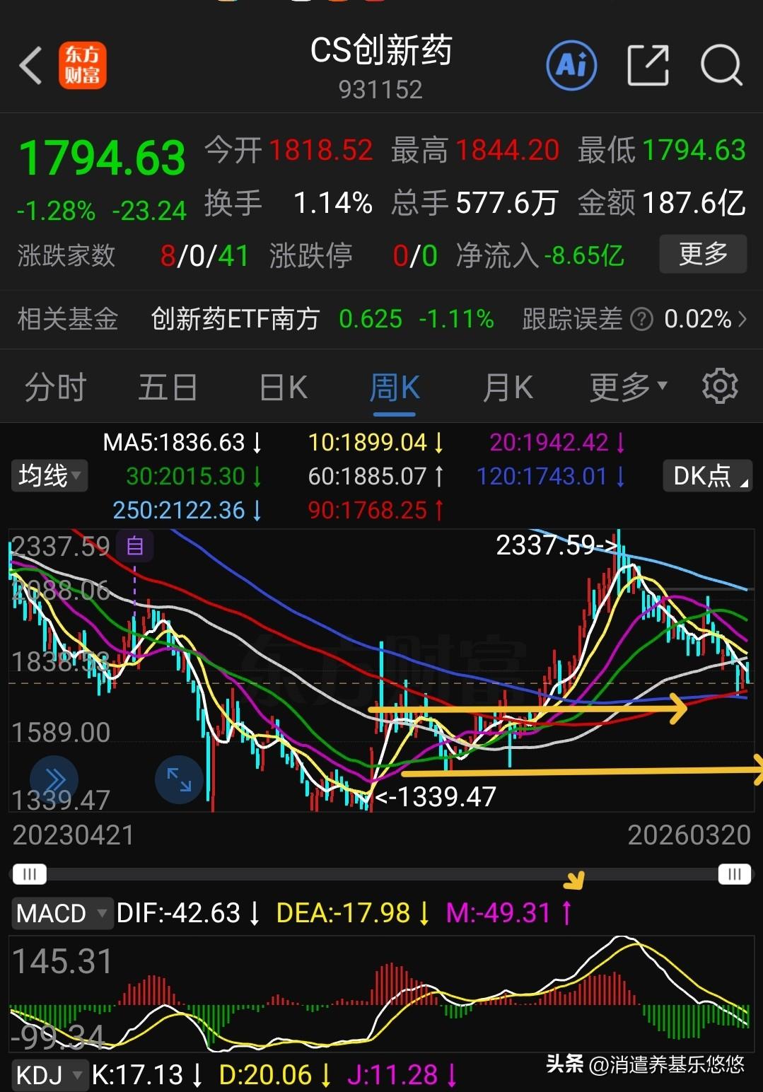 创新药回调空间有多大? 下图是港股通创新药及中证创新药走势。短线明显的是下跌趋势,港股通创新药下周首先是要回踩前面低点支撑,大约还有6%空间。 假如这次回踩到这个位置能止跌企稳,那么后面还要继续反弹到上方压力线附近。 如果回踩到前低支撑没有止跌企稳,那就会继续探底,第一目标是考验250周线支撑,大约还有10%下跌空间。 中证创新药走势也不乐观,它一般是跟随港股通创新药走势,假如近期下面低点守不住的话,有可能回踩周线前面那个小双底支撑,回调时间比较长,周线级别,大约还有16%的下跌空间。 总之,大环境不配合,创新药走势也不会好,创新药磨底时间比较长,要做好长期思想准备,短期小仓位参与做波段操作,中长期慢慢低吸布局,预计今年它的性价比还是不错的。