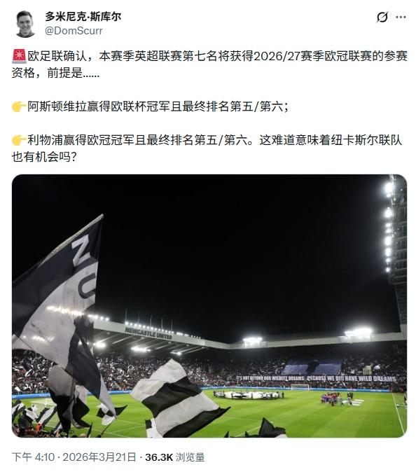 如果利物浦拿下欧冠 维拉拿下欧联 且两队都无缘前五的情况下,英超下赛季会有7对打欧冠联赛