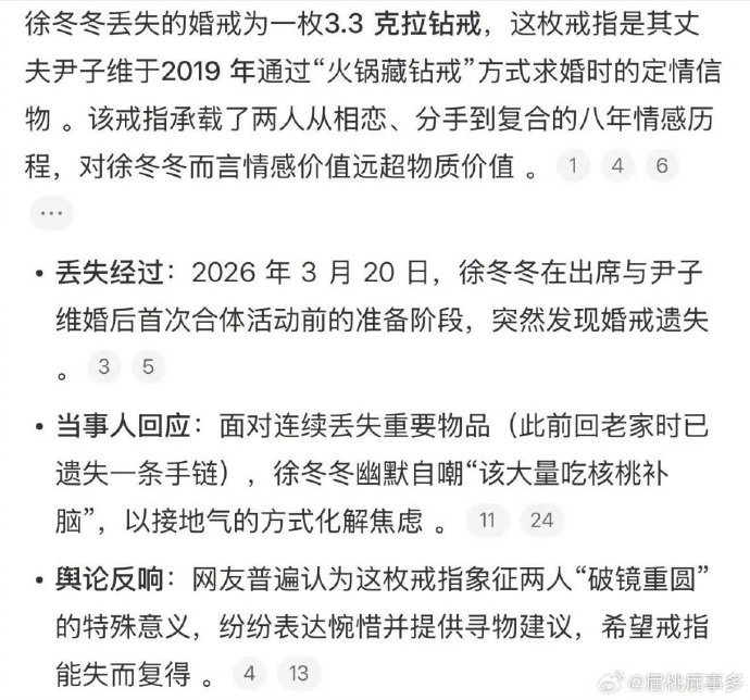 徐冬冬丢的是3.3克拉鸽子蛋 徐冬冬丢的鸽子蛋居然有3.3克拉🥰 说出来真的太震撼了,3.3克拉!就是尹子维求婚时送她的那枚,光看图就被狠狠戳到,火彩饱满到快溢出屏幕,璀璨夺目,这么珍贵又有意义的戒指丢了,真的太可惜,太让人惋惜了!