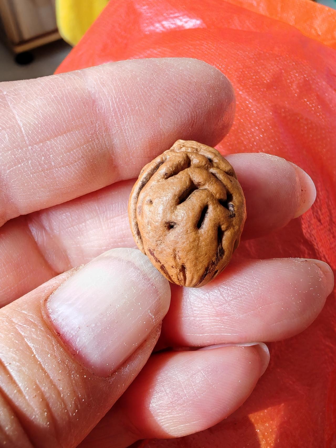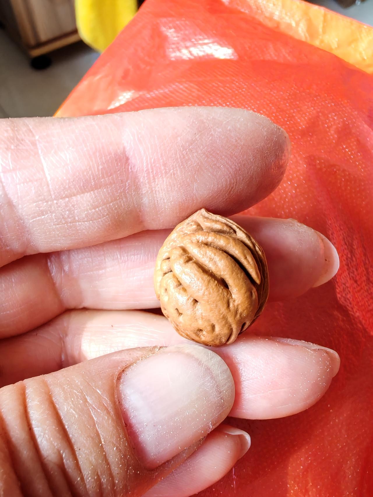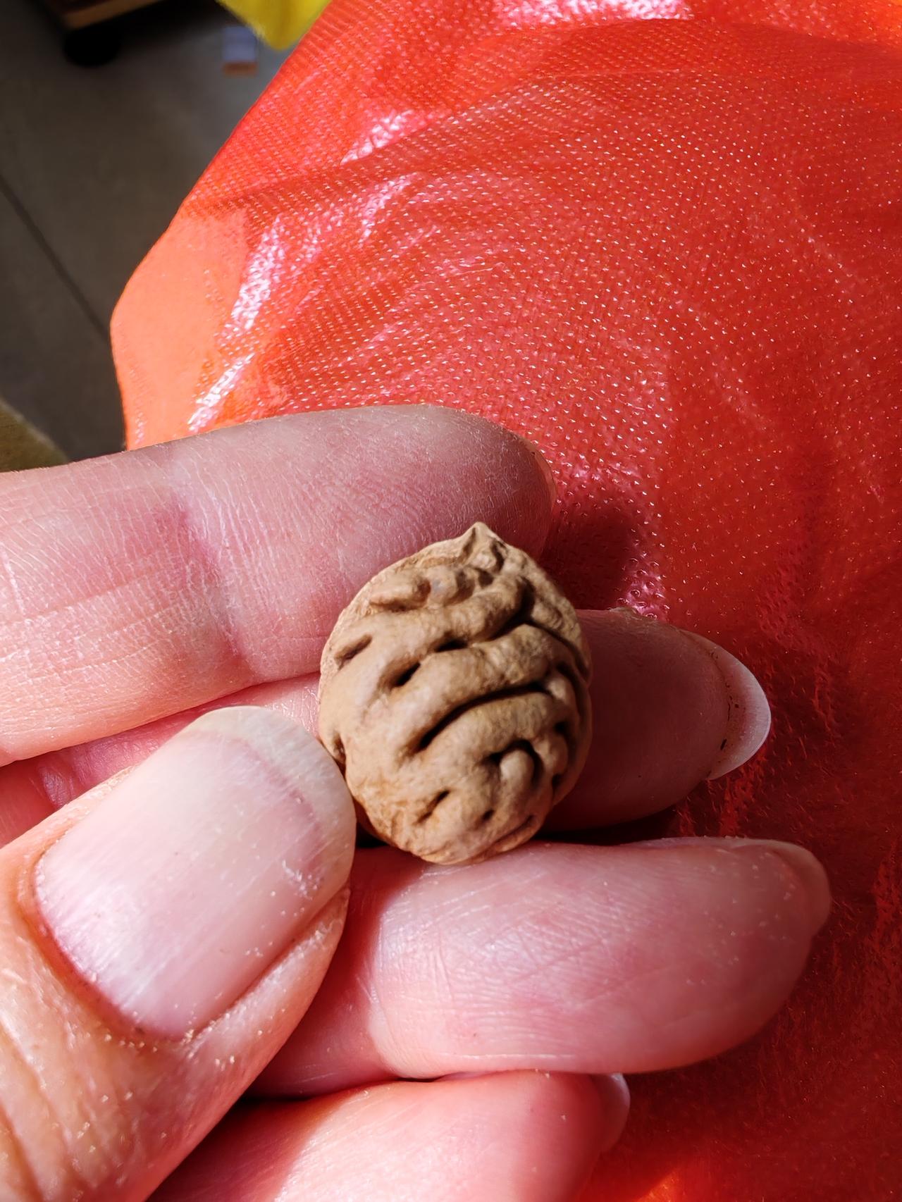 真的很像手呀!这种桃核花纹像人的手,所以叫佛手纹! 人们根据各种桃核的花纹给出了各种形象的名字。 有脑纹、蚂蚁纹、暴龙纹、通天纹等等。 美好的名字美好的祝愿! 愿我们平平安安,幸福永运!