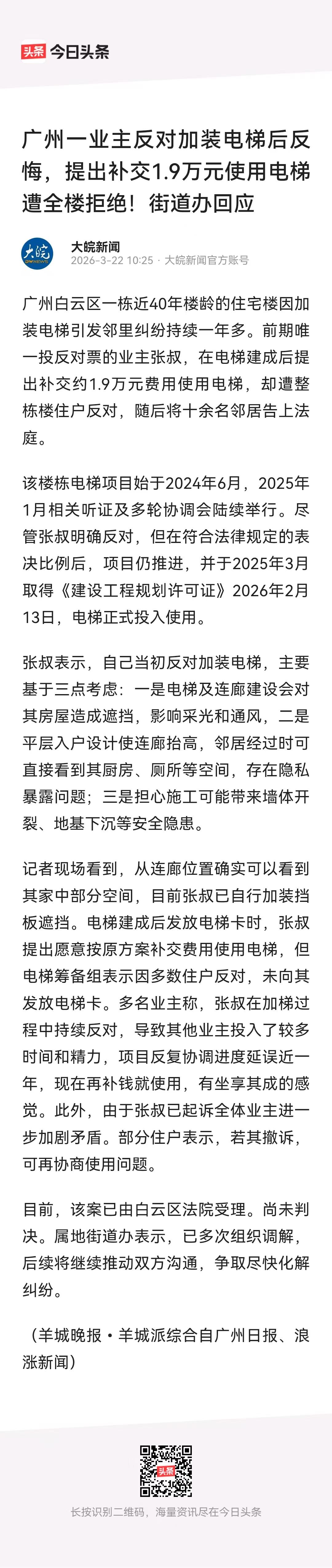 广东广州,1栋有近40年楼龄的楼房,没有电梯,很不方便,大家商量,决定安装电梯,男子却投了唯一的反对票,因为他的反对,导致电梯的安装延迟近一年,不过电梯还是顺利安装了,谁知电梯刚安装好,男子要坐享其成,提出补交1.9万,要使用电梯,可大家都反对他,他就起诉大家。 大家激情澎湃,说起安装电梯的事情,大家你一言我一语,越说越激动,大家纷纷拍手叫好,都赞成安装电梯。 安装电梯,众望所归。 他们的这栋楼房,是个老房子,有近40年楼龄了,最初入住的那一批住户,大多都已经上了年纪,他们一直都是爬楼梯,实在是爬不动了。 年轻人上下班也很累,大家都不想爬楼梯。 后来有人建议,安装电梯,呼声一出,一呼百应,大家一说起安装电梯这件事,都似乎找到了共鸣,纷纷讨论安装电梯的好处。 于是大家都挤在一起,讨论着安装电梯的事情。 他们也是有考虑的,他们的是老房子,安装电梯可能有困难,毕竟安装电梯可能要破坏原来的房子结构。 如此一来,可能就会影响房子,他们的房子本来就是老房子,当初建房的时候,是没有安装电梯的设计的。 因此他们要安装电梯,手续很麻烦,要考虑很多东西,还要审批,经过同意之后,才能安装电梯。 安全事关每一个人,虽然大家都想使用电梯,但也考虑了这一点。 后来他们经过考虑,分析,发现他们这栋楼要安装电梯还是可以的。 这个好消息让大家都很兴奋,大家纷纷出钱,要找人来安装电梯了。 这个时候张叔却跳了出来,他反对安装电梯,他说他不使用电梯,也不出一分钱。 大家都说得好好的,这个时候张叔跳出来投反对票,事情被耽搁了。 因为张叔的反对,导致他们投入了很多时间和精力,他们需要反复地和张叔协商这件事情。 但张叔就是不同意,事情陷入了僵局,差不多一年的时间,大家都干着急着,他们看到张叔,内心就莫名其妙地恼怒。 所有人都同意安装电梯,就张叔这么一个人,整得大家都不得安宁,所有人都要围着他转。 不过即使张叔反对这件事情,依然没能阻止电梯的安装,整栋楼的住户,申请安装电梯,经过审核之后,他们还是可以安装电梯得。 电梯最终还是顺利建成,当大家乘坐电梯上下楼,方便多了,大家都乐得见人就笑,大家纷纷夸有了电梯之后,生活品质提高了,人也精神抖擞了。 这个时候,张叔看着大家乘坐电梯,一个个都挂着一张灿烂的笑脸,看着大家如此方便,他后悔了。 他要坐享其成,他愿意补交1.9万元。 可这个时候,所有的住户都出来反对张叔乘坐电梯。 真是牵着不走打着倒退,张叔的要求让大家都很膈应。 当初大家热情高涨,要安装电梯,因为张叔的反对,让大家烦恼了一年,为了这件事,大家东奔西跑,身心憔悴,现在电梯建好了,大家方便了,张叔倒是坐享其成了。 大家心里不舒服,都不同意张叔乘坐电梯。 这时张叔说出了自己不愿意安装电梯的原因,他说,当初之所以反对安装电梯,是因为安装的电梯会对他的房屋造成阻挡,还会影响采光和通风,并且平层入户设计会让连廊抬高,邻居经过的时候,可以看到他家的厨房和厕所,会看到他的隐私。 除此之外,他最担心的就是,他们的楼房是老房子,如果安装电梯,他害怕施工会带来墙体开裂,地基下沉的安全隐患。 可在其他业主看来,张叔就是马后炮,就是想坐享其成,大家依然反对,他无奈之下,起诉他其他业主,要求使用电梯。 那么他的诉求是否会得到支持呢? 1、电梯属于建筑物,共有部分,全体业主享有共有和共同管理的权利。 《民法典》第二百七十一条规定,电梯作为加装的共用设施,属于业主共有。原反对业主作为业主之一,对共有部分享有法定的使用权。 即使张叔当初反对,只要他分摊费用,他后期还是可以使用电梯的。 2、张叔在使用电梯时,愿意分摊费用,这并不违反公平原则。 《民法典》第六条规定,未出资的业主在使用电梯前,必须支付相应的集资款及后续维保费用。只要其按原筹资方案补交费用,其他业主无权拒绝交付电梯卡。 所以即使业主们都反对,只要张叔愿意分摊费用,他还是可以使用电梯的,他是可以获得胜诉的。 那么你对此事有何看法呢?来源:大河报 2026.03.22
