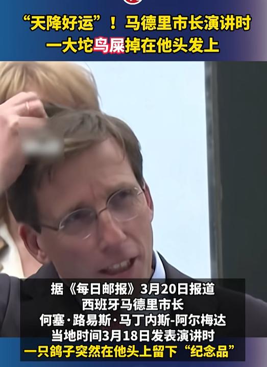 这情商绝了,马德里市长演讲被鸽子精准“投弹”,神反应化解尴尬,竟整出了名场面。 当地时间3月18日,马德里正办着纪念为新闻自由牺牲记者的纪念碑揭幕仪式,市长何塞·路易斯·马丁内斯-阿尔梅达正站在台上正经演讲呢,一只鸽子突然从天上飞过,一大坨鸟屎不偏不倚就砸在了他头发上,还是刚剪没多久的新头发。 这一下来得猝不及防现场瞬间静了,那尴尬劲儿隔着屏幕都能感受到。 但市长是真沉得住气一点没慌,抬手轻轻擦掉头上的脏东西,脸上半点儿怒气都没有,反倒笑着开启了调侃模式直说这鸽子也太会挑时候了,偏偏选自己刚剪完头发这天来送“纪念品”。 更绝的是他还顺着当天的仪式主题接话,对着台下的人打趣都说干新闻是高危职业,今天可算见识到了,我这不是记者的,跟你们凑一块儿都能遇上这意外。 说完还乐呵呵补了句老话说这是天降好运,看来我要走好运了。 几句话一出来刚才的尴尬瞬间烟消云散,现场气氛直接轻松起来,台下的人全被他逗笑了。 不得不说这位市长的情商和临场应变能力是真的牛,遇上这种换谁都觉得糟心的突发状况,不恼不躁还能用幽默自嘲的方式轻松化解。 既没扫了纪念仪式的兴,还让大家看到了他特别接地气、亲切的一面。 生活里谁还没遇上过这种猝不及防的小倒霉,与其手忙脚乱、气到上头,不如学学这位市长笑着接招,说不定那些看似糟心的瞬间,真的会变成藏着好运的小插曲呢。 信息来源:观察者网《“天降好运”!马德里市长演讲时,一大坨鸟屎掉在他头发上》2026-3-21