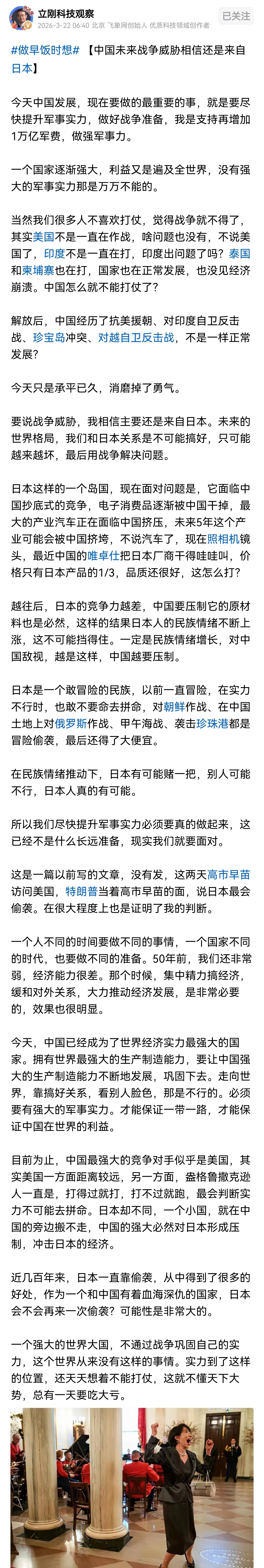 特朗普说日本是最会搞偷袭的国家,你如果以为这只是特朗普随口开的一句玩笑,你就想的简单了。这句半开玩笑半认真的一句话,反映了日本这个国家在他心中的印象,虽然一直利用日本,但美国在心里也是警惕日本。 历史上日本这个国家多次发动过偷袭,从九一八事变,七七事变,一直到偷袭珍珠港。在面对没有确切把握的时候,日本敢于偷袭,主要也是因为它敢于冒险,并且从这些冒险中讨到了便宜。 项立刚认为,最应该防备日本的不是美国,而是我们,我们最应该防的也不是美国,而是日本。一是日本离我们近,美国与我们远,近处的隐患总是大于远方的挑战。二是美国的盎格鲁撒克逊人和日本人不同,美国人虽然傲慢,但讲究实力,一切从实力出发,打的过就打,打不过就降,他不会轻易的拼命。而日本不是的,面对实力强于自己的对手,日本敢于冒险,甚至去拼命,就像发起太平洋战争一样。三是我们的快速发展,实力的强大,天然让日本不放心,让他们的优越感不再,必然激起他们的民族情绪。 特别认同项立刚的观点,实力到了那个位置了,你还想韬光养晦,像一只人畜无害的“小白兔”,已经是不可能了。