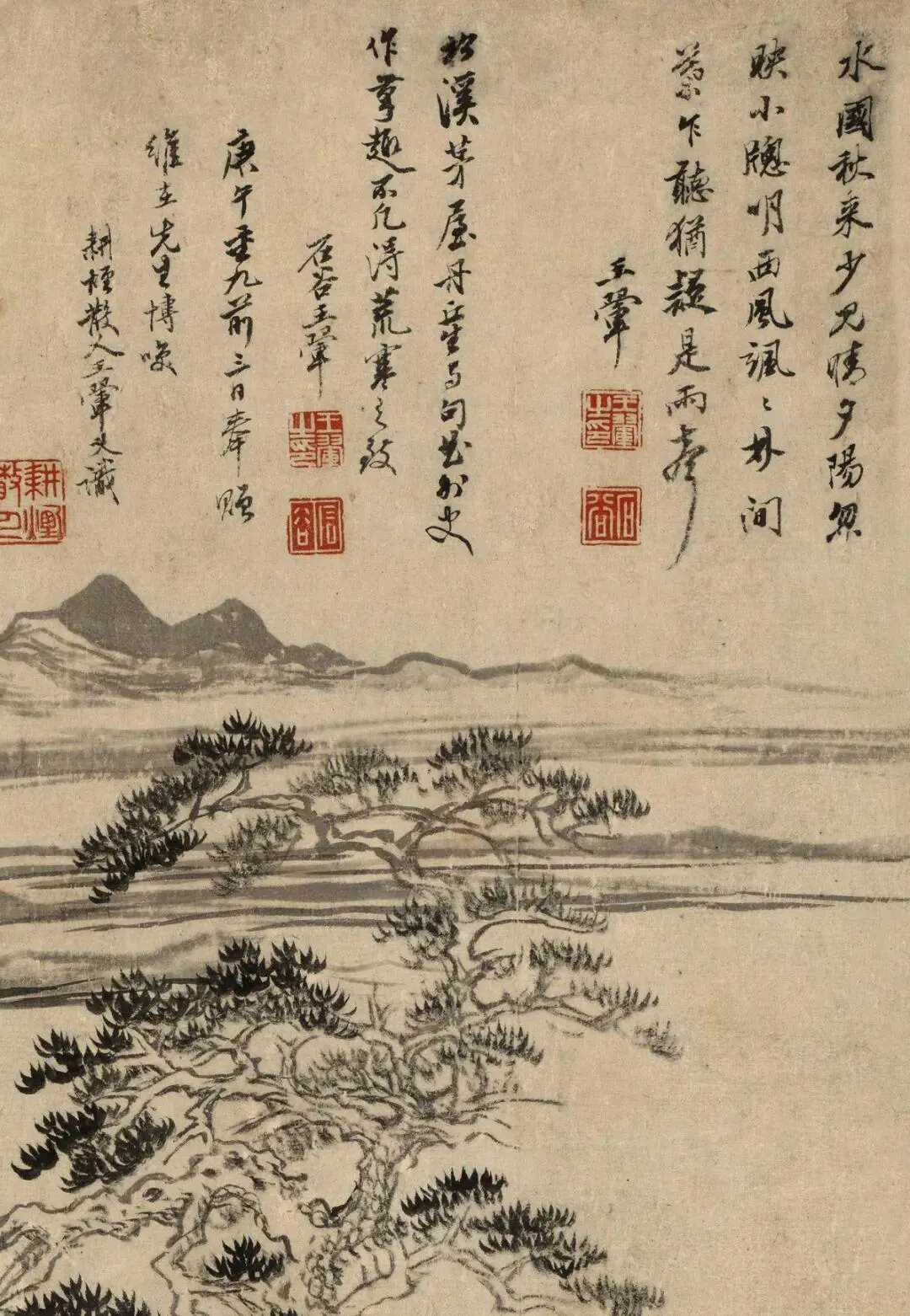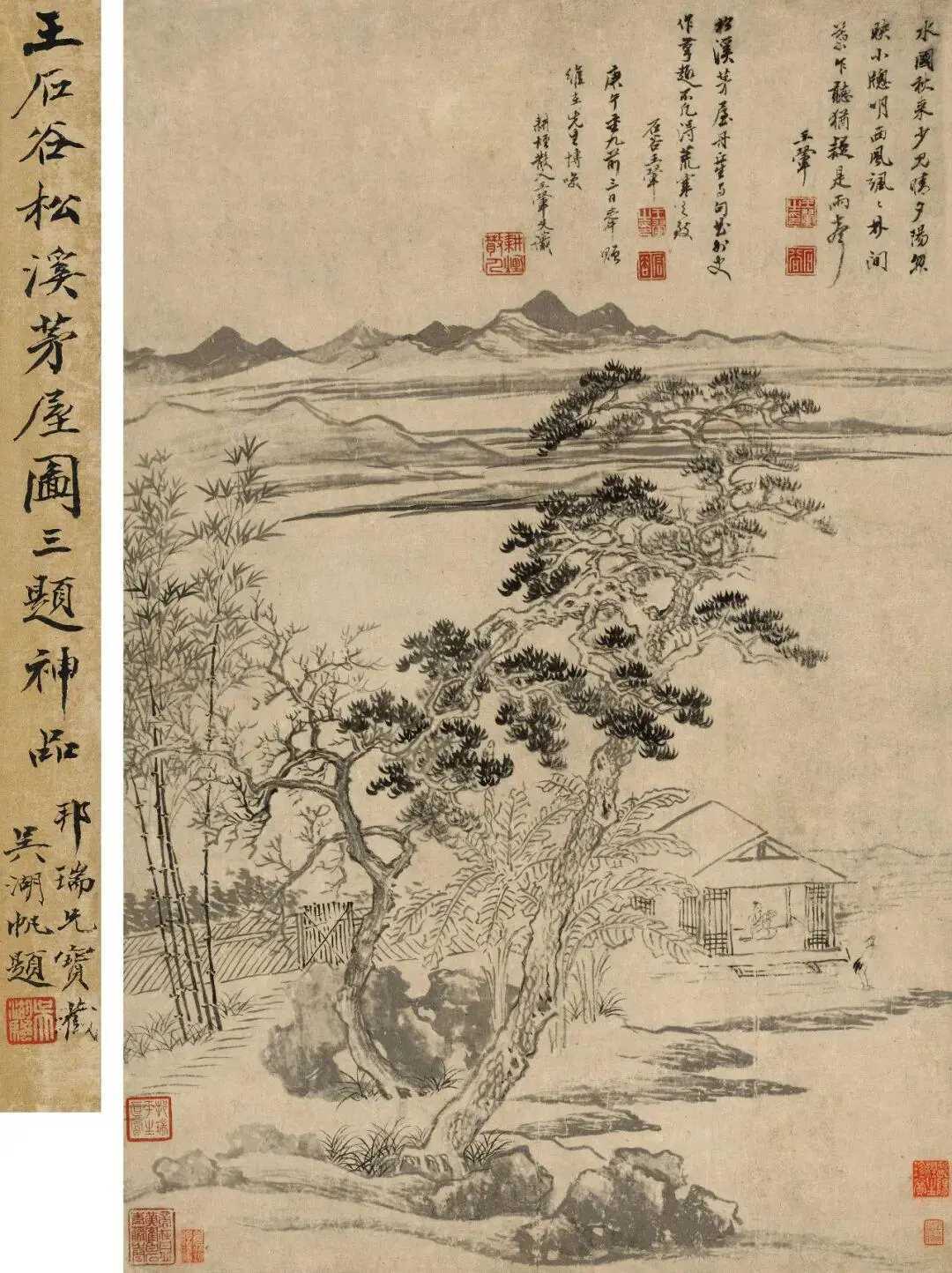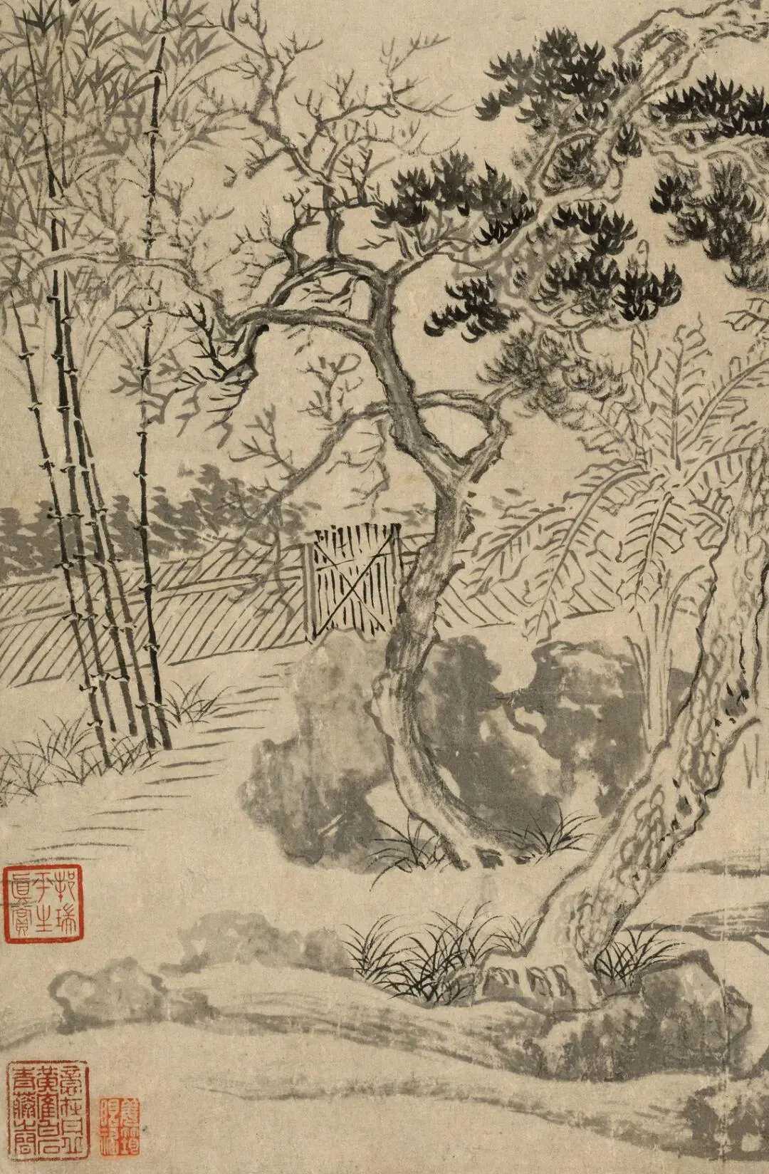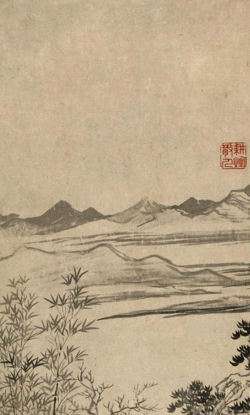 王翚《松溪茅屋图》,纸本 62×40 cm。苍松独立,翠竹数竿,矮屋一椽,围短篱,绕清流,一士人在绿筠、碧水、青山映照间启户读书,屋外孤鹤徘徊,回顾主人,仿佛若有所待。俗客不到,松竹之声皆寂,天空水阔,意境清远静寂,故笔墨亦清淡无燥色。唯松叶与鹤尾一点浓墨相照应,于是精神跃出。这就是中国风遇见艺术