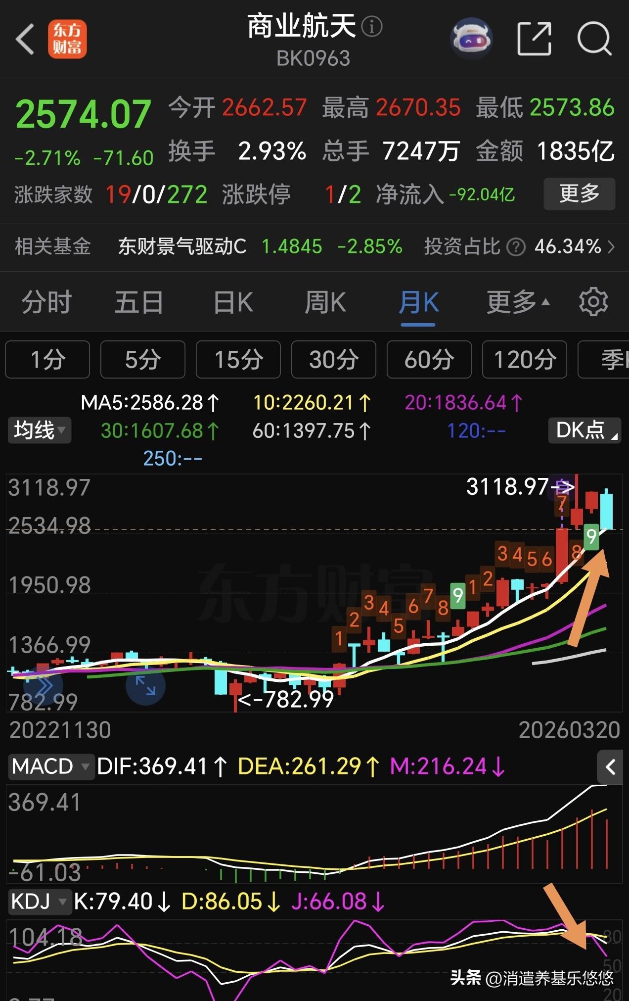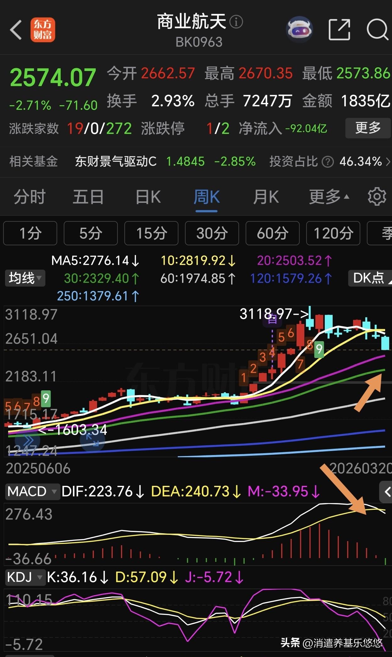 商业航天何时见底? 商业航天自2026年1月12日高点到现在已经回调了两个月,这两个月基本上是缓慢阴跌,目前仍然处在下降通道中,本周连续下跌跌,彻底摆脱了前面横盘整理区间,形成了明显的下跌趋势,预计下周还会继续探底。 从月线来看,已经跌破5月均线支撑。日线预计要回踩下方半年线支撑,大约有7%下跌空间。日线macd已经下零轴,等待它水下金叉时就基本见底了,所以,想抄底的还要耐心等待。