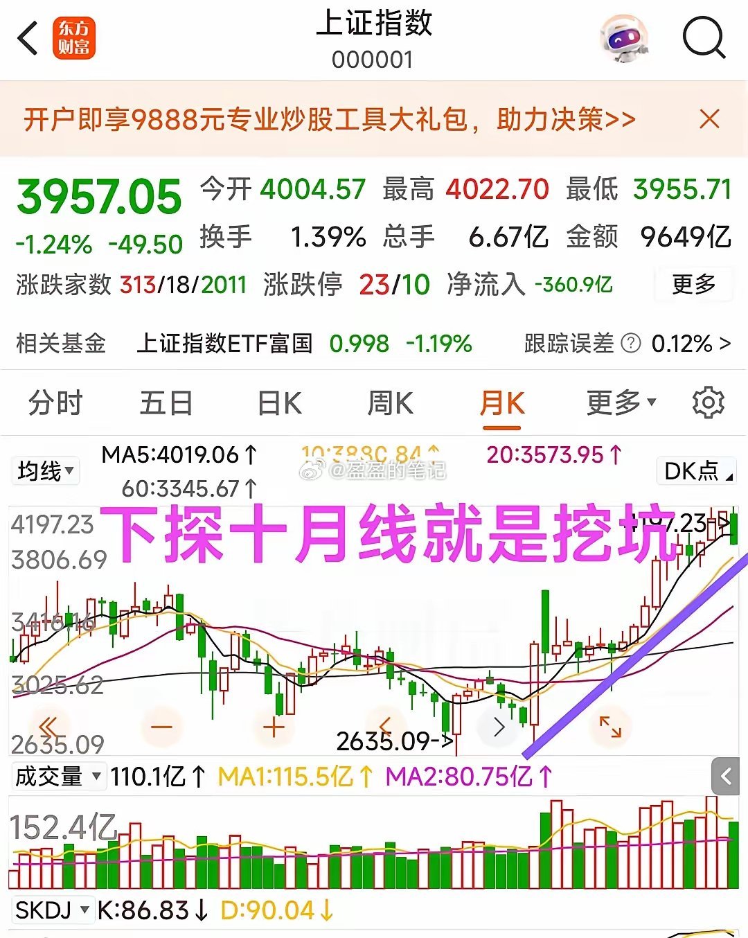 为什么跌破四千一定是挖坑? 别被盘面的恐慌吓坏,周五四千点失守,本质就是一次精准的诱空洗盘,是主力给散户挖的黄金坑。 现在的A股跌下去很难。从顶层逻辑看,激活资本市场、提振财富效应,是当前稳预期、扩内需的核心抓手。楼市的蓄水池功能已经见顶,股市必须接过接力棒,成为居民资产增值的主渠道。这种时候谈“指数大破位”,本质是在跟国家意志对着干。所谓“结构性牛市”,从来不是喊口号——它意味着指数可以震荡、可以挖坑,但绝无可能走熊,因为每一次向下的试探,都会被无形的手稳稳托住,最终目的只有一个:让更多人相信“慢牛”,把钱留在市场里。 再看技术面,把A股三十多年的月K线拉出来看看,规律比什么都直白:每一轮像样的上升趋势确立之后,第一次跌破5月均线,从来不是趋势反转,而是主力清洗浮筹的假摔。接下来的下探10月线,更是标准的“挖坑动作”——把不坚定的筹码震出去,把便宜的筹码捡回来,然后再一鼓作气,拉出更有爆发力的主升浪。周五跌破四千点,就是这个剧本的重演。指数看起来难看,不过是月线级别回踩的必经之路,是给敢在恐慌里伸手的人,送的一份珍贵的筹码。 很多人盯着日线的阴线瑟瑟发抖,却忘了看月线的大趋势。我们现在站在的,是一轮长周期牛市的起点,不是终点。四千点不是天花板,是未来行情的垫脚石。那些在坑里哭天抢地、割肉离场的人,下个月回头看,只会拍着大腿后悔——自己把最珍贵的筹码,亲手送给了别人。