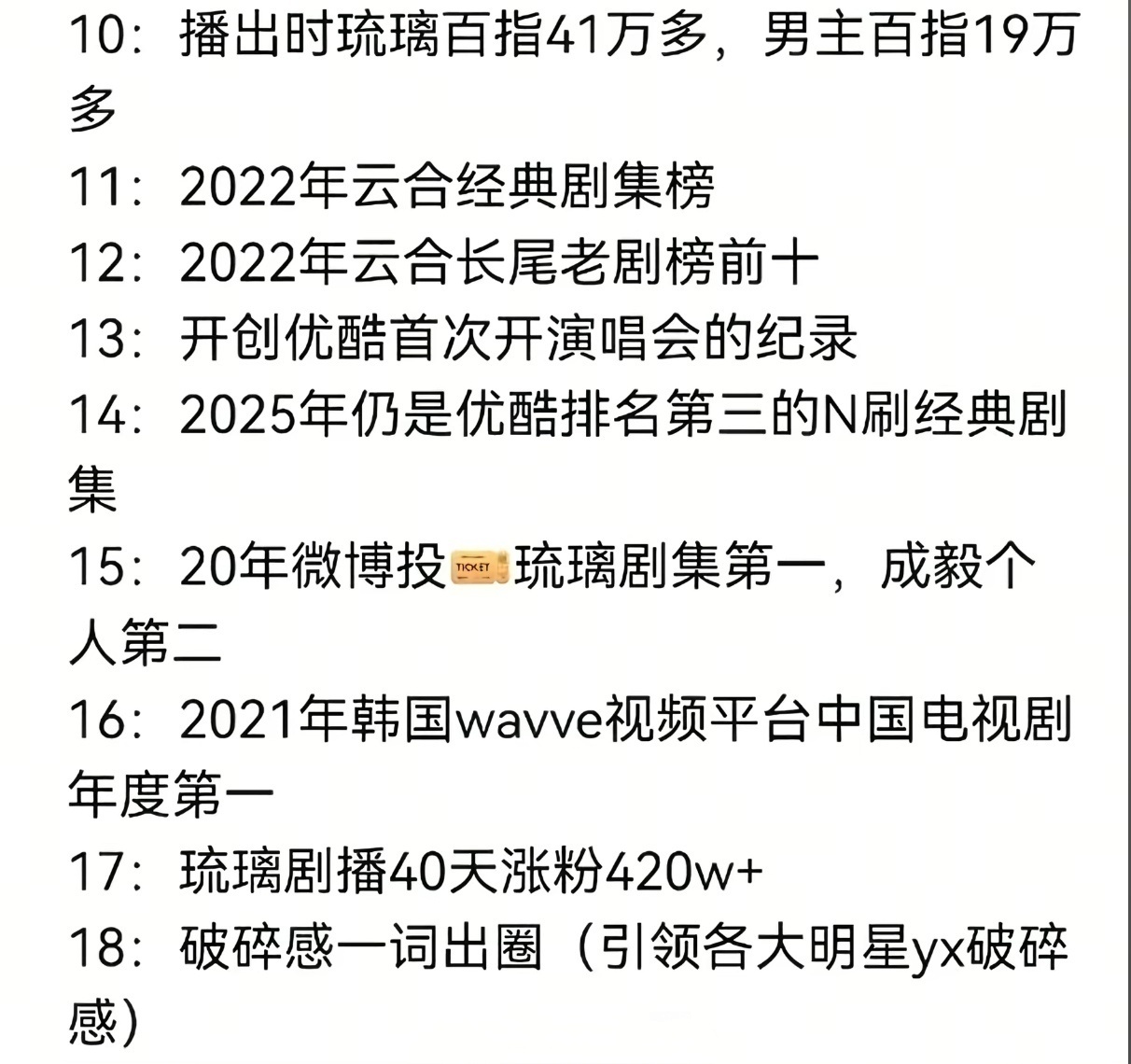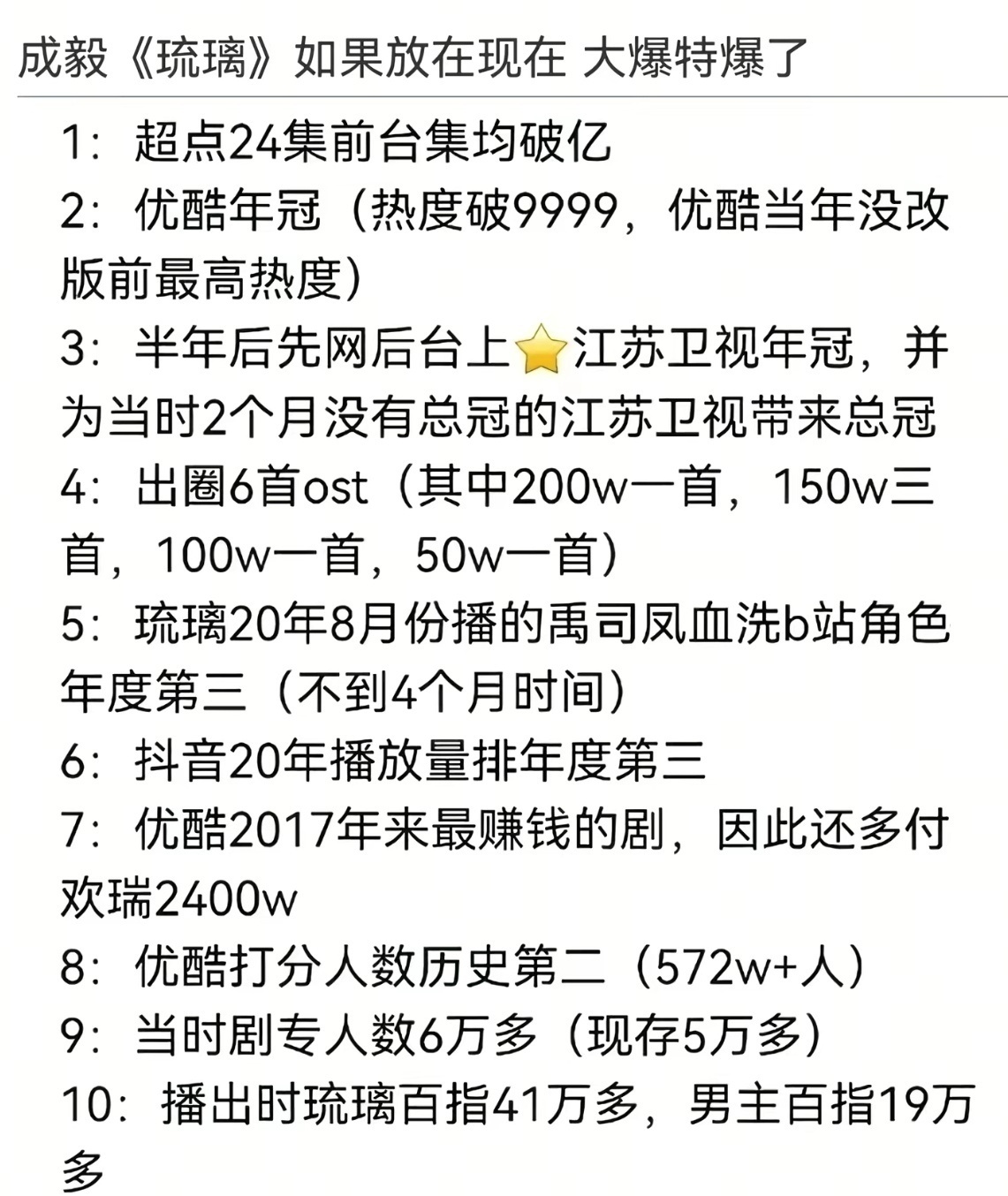 ie们以后吹爆剧的时候一定要把琉璃带上,不能因为成毅爆剧多就忽略了琉璃。至今没有任何一部剧敢和当年的琉璃一样超点二十几集!成毅是真正的不限档期,不限题材,不限平台,单扛top☝文有长安二十四计,武有莲花楼和赴山海,仙侠有琉璃和沉香如屑!