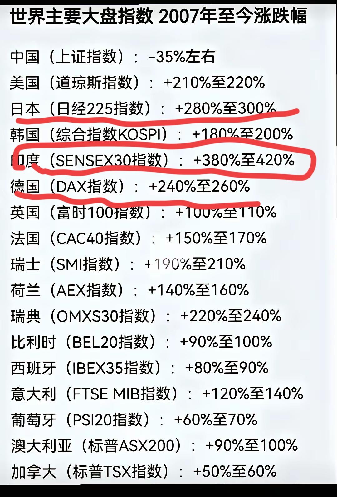只比股市的涨幅太片面了,还要考虑股市的广度和宽度,近二十年来,全球主要的股市涨幅基本都超过100%,三哥的涨幅甚至达到了300%。 股市这个势头,除了涨幅还得看宽度,有的股市在二十年内过大了一倍以上,那么它的高度必然有所降低,这是一个正常的逻辑。 资本主义的股市自由资本推出来的,其他的股市则是由热情和理想支撑的,虽然涨幅没那么大,但是风险也相对没那么高。