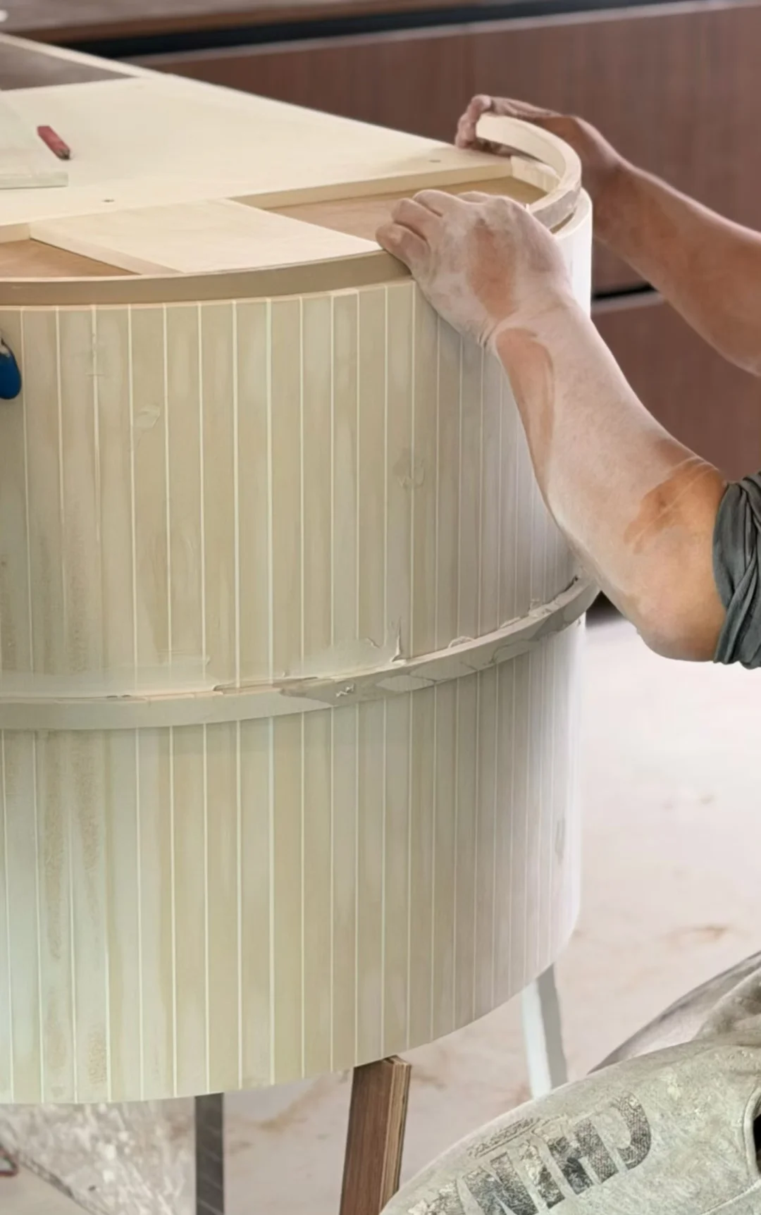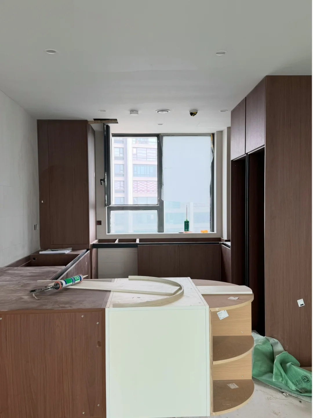 金基璟樾府安装阶段🔚 木作安装收尾阶段,落地细节很OK!现场安装台面师傅精细化尺寸比例打磨,期待安装结束保洁后的家🥰 从开始拆除到入住收纳,小北把控每一步🙋🏻♀️ -
