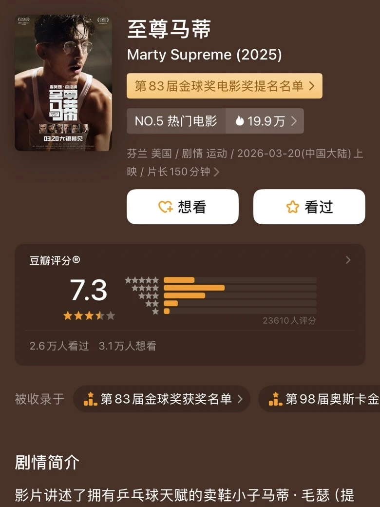 最近《沙丘 3》预告刷屏全网,暗黑史诗感拉满,却要等到今年 12 月才能赴约。 好在甜茶另一部新片《至尊马蒂》已登陆国内院线。海报里的他彻底告别往日俊秀少年感,戴上眼镜,一副憨厚呆萌的模样,反差感十足。 影片成功入围第 98 届奥斯卡金像奖“最佳影片”,即便最终未摘得奖项,能获得奥斯卡提名已然印证实力。目前豆瓣评分 7.3,口碑好于 69% 的剧情片。 你会走进影院,打卡甜茶这部颠覆形象的奥斯卡提名新作吗?