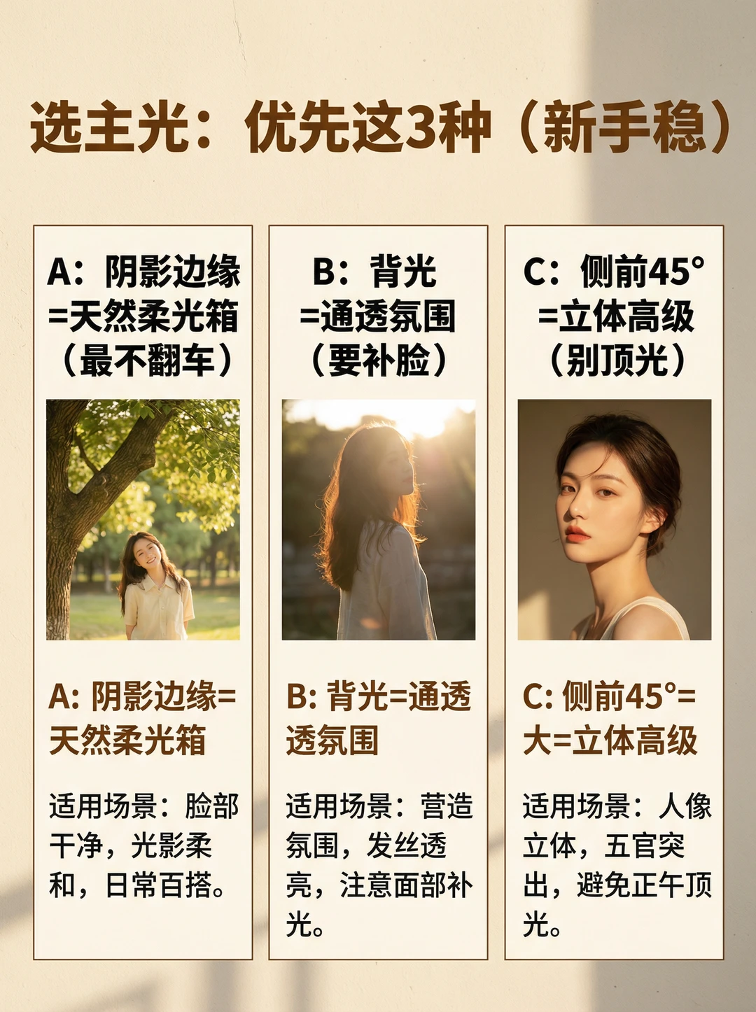 ✅ 第一盏:主光(决定脸好不好看) 别站在直顶光里!优先选: