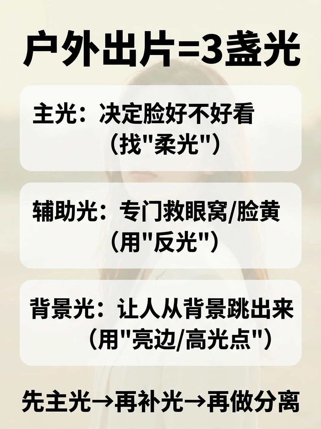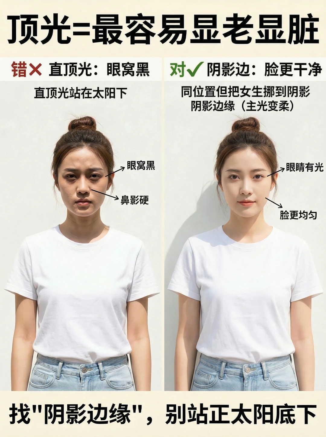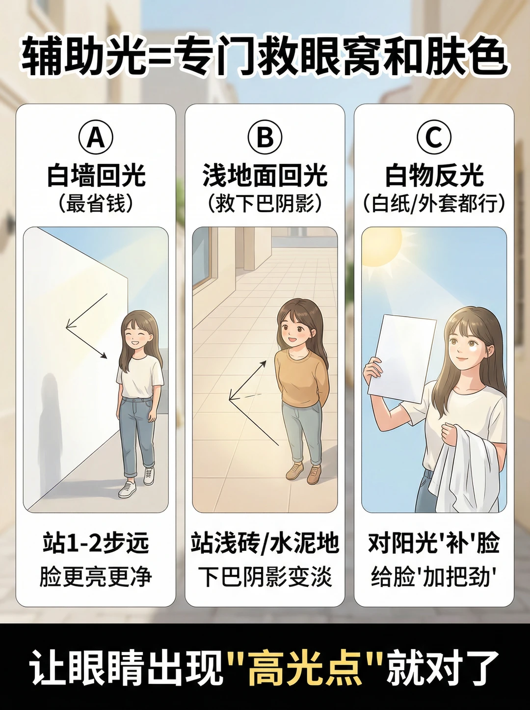 ✅ 第二盏:辅助光(专门救眼窝和肤色) 不用专业器材也行: