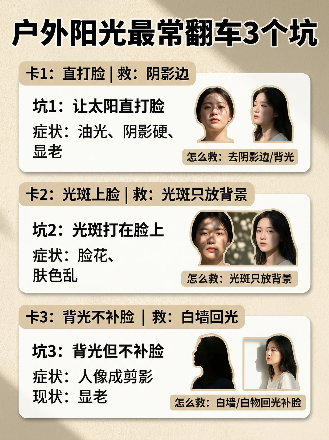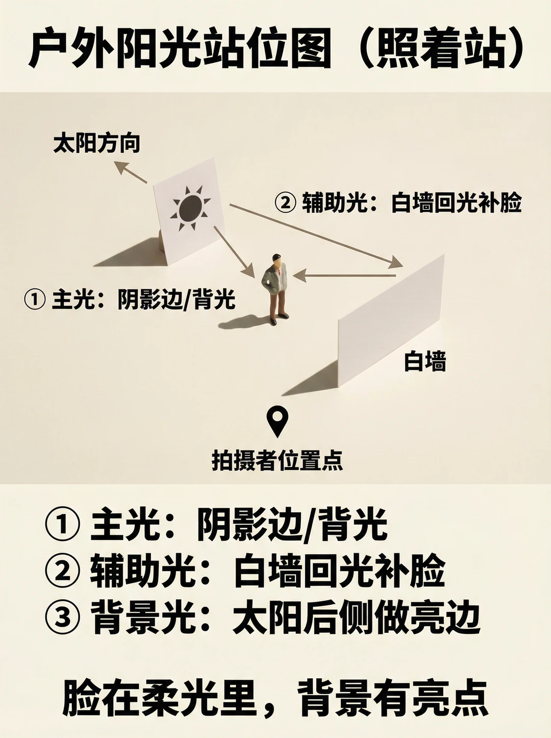 大太阳底下拍照最容易翻车:眼窝黑、脸黄、鼻影硬、法令纹深,还怎么摆都不高级。 这篇我把户外阳光拍法拆成普通女生也能照抄的“3盏光思路”,再送你正午的4个救命站位👇