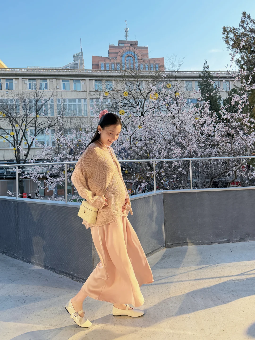 北京的春天来啦 最近阳光好 总是想出门溜达 孕中期趁着身体还没有那么沉重 出门感受春暖花开的能量太舒服啦🌸 肚子虽然越来越大 但怀孕后还是很喜欢穿漂亮衣服 粉色蓝色都太适合春天了 孕期的松弛感轻松get💗🩵