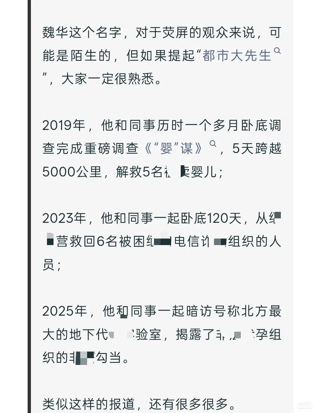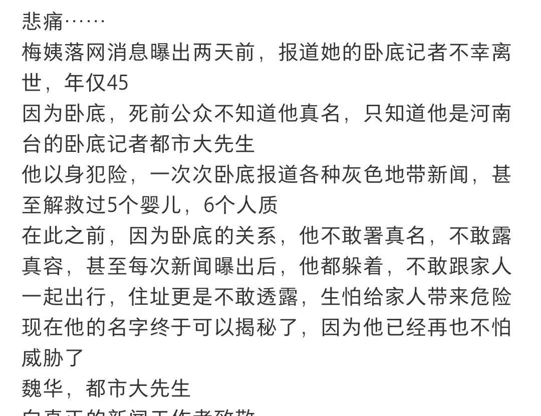 心痛到窒息! 梅姨落网的举国欢腾里,藏着最意难平的遗憾,那个追了这起案子十年、拼尽全力为寻亲家庭撑灯的人,终究没等到这一天。45岁的魏华,那个藏在“都市大先生”背后的名字,在梅姨落网前两天猝然离世,他用二十年卧底生涯活成了黑暗里的光,却把自己永远留在了追光的路上。 这世上从没有天生的勇者,只是有人选择扛起责任直面黑暗。他躲着家人出行、不敢署真名露脸,把所有危险都揽在自己身上,卧底矿场、深入缅北、追查贩婴,救下5个婴儿6个人质,用一次次向死而生的调查,撕开灰色地带的遮羞布。他从不是站在聚光灯下的英雄,却是真正用血肉之躯守护正义的普通人,把新闻人的良知刻进了每一次冒险里。 我们总说正义会迟到但不会缺席,可那些为正义奔赴的人,却可能等不到花开的时刻。魏华走了,但“都市大先生”的精神从不会消失,因为总有人愿意做黑暗里的提灯人,为我们照亮前路。你心里,是不是也一直记着这些默默守护的无名英雄?